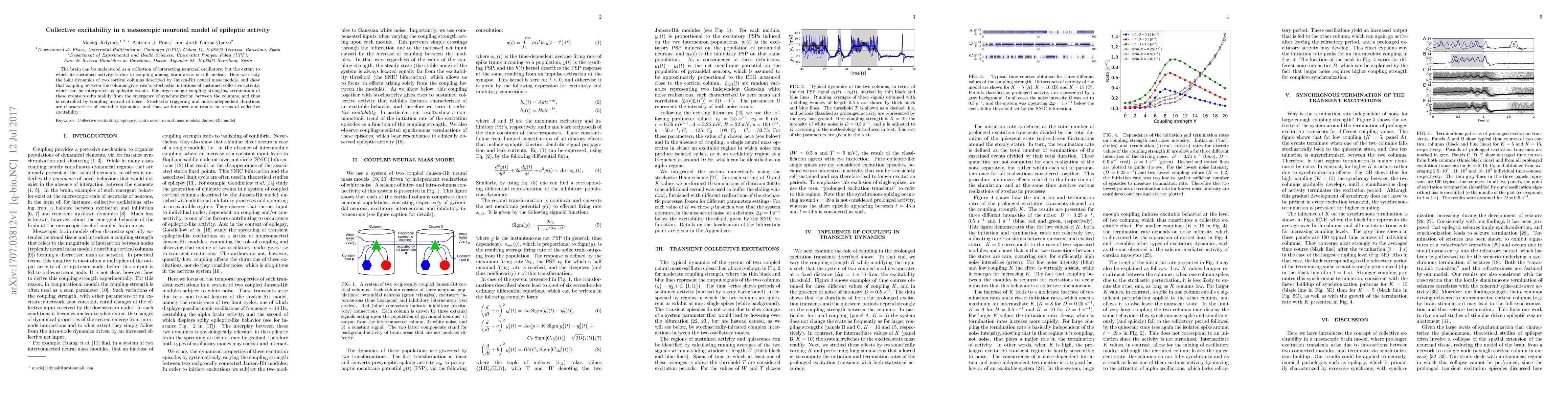 The brain can be understood as a collection of interacting neuronal oscillators, but the extent to which its sustained activity is due to coupling among brain areas is still unclear. Here we study the joint dynamics of two cortical columns described by Jansen-Rit neural mass models, and show that coupling between the columns gives rise to stochastic initiations of sustained collective activity, which can be interpreted as epileptic events. For large enough coupling strengths, termination of these events results mainly from the emergence of synchronization between the columns, and thus is controlled by coupling instead of noise. Stochastic triggering and noise-independent durations are characteristic of excitable dynamics, and thus we interpret our results in terms of collective excitability.