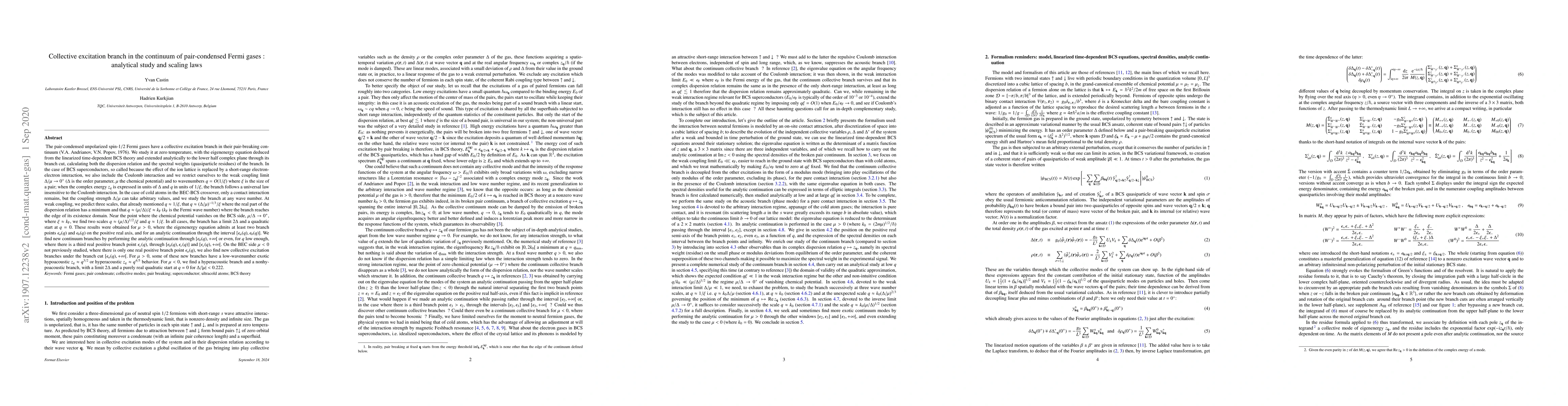 The pair-condensed unpolarized spin-$1/2$ Fermi gases have a collective excitation branch in their pair-breaking continuum (V.A. Andrianov, V.N. Popov, 1976). We study it at zero temperature, with the eigenenergy equation deduced from the linearized time-dependent BCS theory and extended analytically to the lower half complex plane through its branch cut, calculating both the dispersion relation and the spectral weights (quasiparticle residues) of the branch. In the case of BCS superconductors, so called because the effect of the ion lattice is replaced by a short-range electron-electron interaction, we also include the Coulomb interaction and we restrict ourselves to the weak coupling limit $\Delta/\mu\to 0^+$ ($\Delta$ is the order parameter, $\mu $ the chemical potential) and to wavenumbers $q=O(1/\xi)$ where $\xi$ is the size of a pair; when the complex energy $z_q$ is expressed in units of $\Delta$ and $q$ in units of $1/\xi$, the branch follows a universal law insensitive to the Coulomb interaction. In the case of cold atoms in the BEC-BCS crossover, only a contact interaction remains, but the coupling strength $\Delta/\mu$ can take arbitrary values, and we study the branch at any wave number. At weak coupling, we predict three scales, that already mentioned $q\approx 1/\xi$, that $q\approx(\Delta/\mu)^{-1/3}/\xi$ where the real part of the dispersion relation has a minimum and that $q\approx (\mu/\Delta)/\xi\approx k_{\rm F}$ ($k_{\rm F}$ is the Fermi wave number) where the branch reaches the edge of its existence domain. Near the point where the chemical potential vanishes on the BCS side, $\mu/\Delta\to 0^+$, where $\xi\approx k_{\rm F}$, we find two scales $q\approx(\mu/\Delta)^{1/2}/\xi$ and $q\approx 1/\xi$. In all cases, the branch has a limit $2\Delta$ and a quadratic start at $q=0$. These results were obtained for $\mu>0$, where the eigenenergy equation admits at least two branch points $\epsilon_a(q)$ and $\epsilon_b(q)$ on the positive real axis, and for an analytic continuation through the interval $[\epsilon_a(q),\epsilon_b(q)] $. We find new continuum branches by performing the analytic continuation through $[\epsilon_b(q),+\infty[$ or even, for $q$ low enough, where there is a third real positive branch point $\epsilon_c(q)$, through $[\epsilon_b(q),\epsilon_c(q)]$ and $[\epsilon_c(q),+\infty[$. On the BEC side $\mu<0$ not previously studied, where there is only one real positive branch point $ \epsilon_a(q)$, we also find new collective excitation branches under the branch cut $[\epsilon_a (q),+\infty[$. For $\mu>0$, some of these new branches have a low-wavenumber exotic hypoacoustic $z_q\approx q^{3/2}$ or hyperacoustic $z_q\approx q^{4/5}$ behavior. For $\mu<0$, we find a hyperacoustic branch and a nonhypoacoustic branch, with a limit $2\Delta$ and a purely real quadratic start at $q=0$ for $\Delta/|\mu|<0.222$.