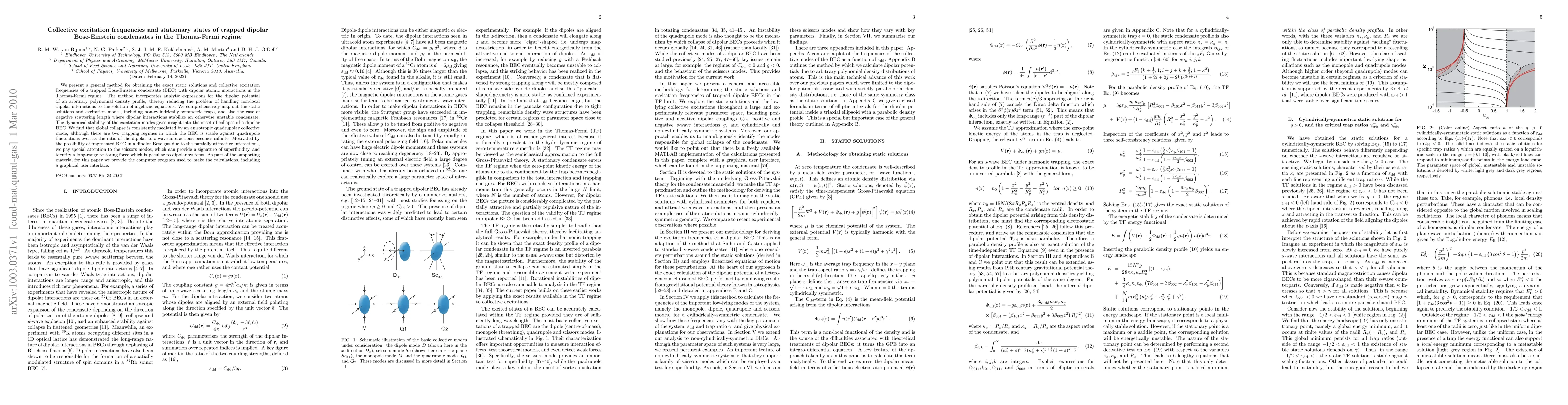 This paper develops a method for determining exact static solutions and collective excitation frequencies in a trapped dipolar Bose-Einstein condensate (BEC) within the Thomas-Fermi regime, accounting for dipolar interactions through algebraic equations. It explores the dynamical stability, collapse mechanisms, and scissors modes, revealing anisotropic quadrupolar modes and stability regimes in dipolar BECs.