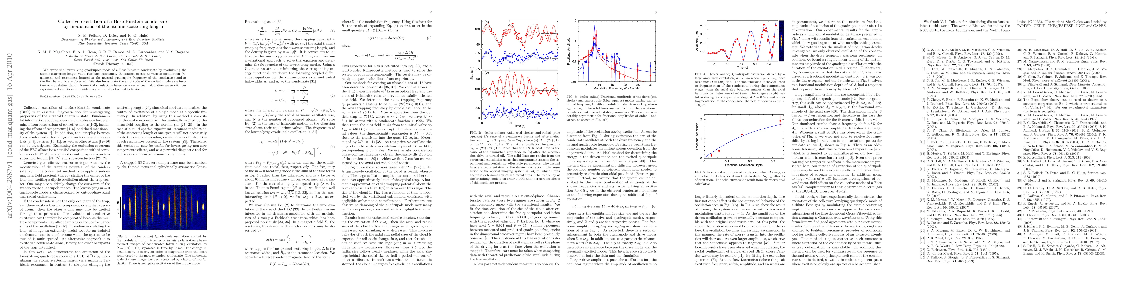 This paper investigates the excitation of the lowest-lying quadrupole mode in a Bose-Einstein condensate by modulating the atomic scattering length through a Feshbach resonance, observing resonances at the natural quadrupole frequency and its first harmonic. Numerical simulations corroborate experimental findings and provide deeper insight into the observed behavior.