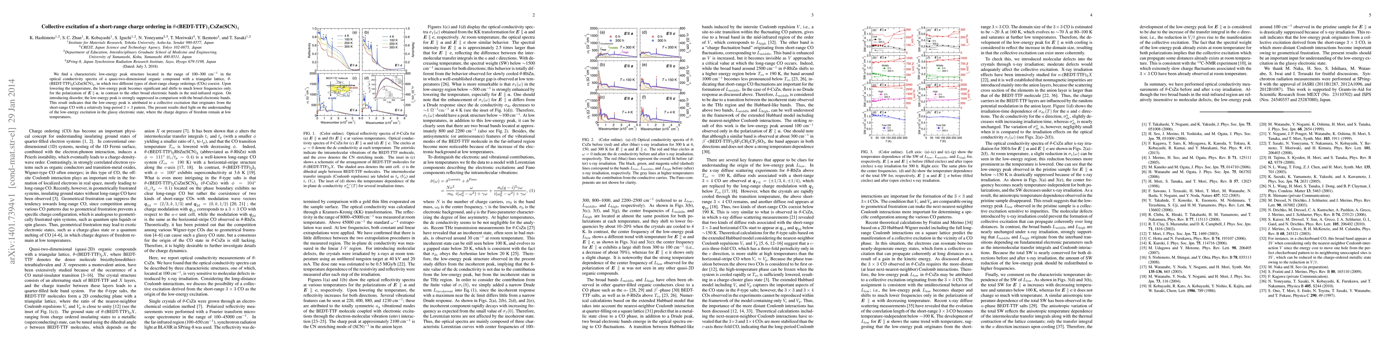 We find a characteristic low-energy peak structure located in the range of 100-300 cm$^{-1}$ in the optical conductivity spectra of a quasi-two-dimensional organic compound with a triangular lattice, ${\theta}$-$\mbox{(BEDT-TTF)}_2\mbox{CsZn(SCN)}_4$, in which two different types of short-range charge orderings (COs) coexist. Upon lowering the temperature, the low-energy peak becomes significant and shifts to much lower frequencies only for the polarization of ${E \parallel a}$, in contrast to the other broad electronic bands in the mid-infrared region. On introducing disorder, the low-energy peak is strongly suppressed in comparison with the broad electronic bands. This result indicates that the low-energy peak is attributed to a collective excitation that originates from the short-range CO with a relatively long-period $3\times3$ pattern. The present results shed light on the understanding of the low-energy excitation in the glassy electronic state, where the charge degrees of freedom remain at low temperatures.