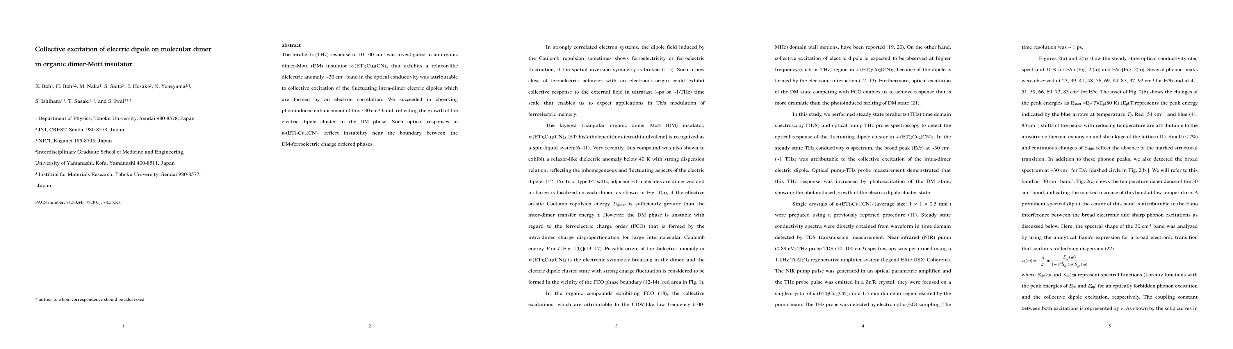 This study investigates the terahertz response in an organic dimer-Mott insulator, revealing a 30 cm^-1 band due to collective excitation of intra-dimer electric dipoles formed by electron correlation. Photoinduced enhancement of this band indicates the growth of dipole clusters in the dimer-Mott phase, reflecting instability near the boundary between dimer-Mott and ferroelectric charge-ordered phases.