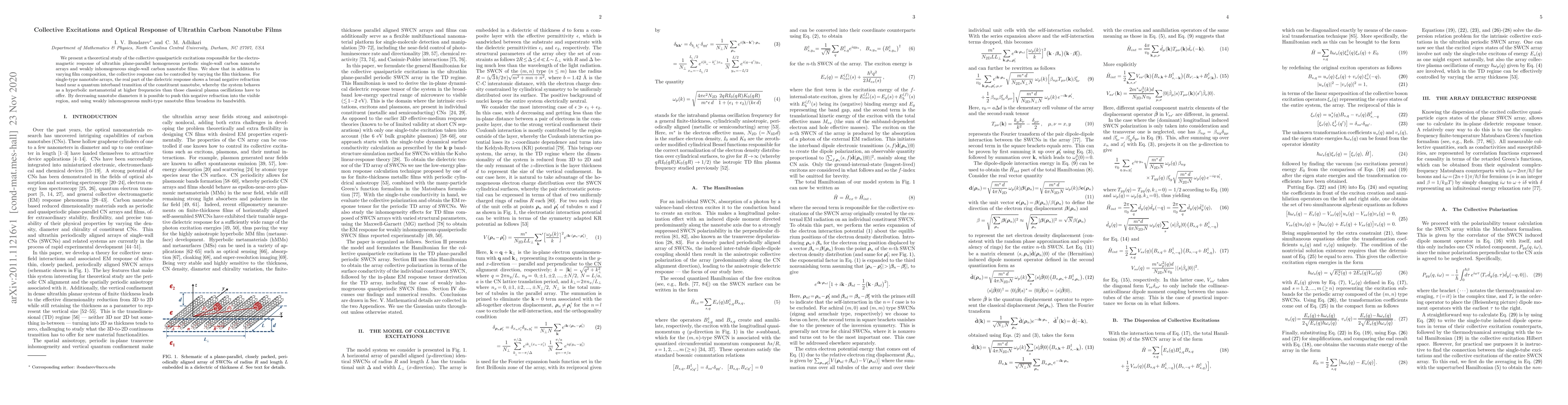This paper explores the collective quasiparticle excitations in ultrathin carbon nanotube films, demonstrating that their optical response can be tuned by varying film composition and thickness. The study reveals that single-type nanotube arrays exhibit negative refraction near quantum interband transitions, functioning as hyperbolic metamaterials at higher frequencies.