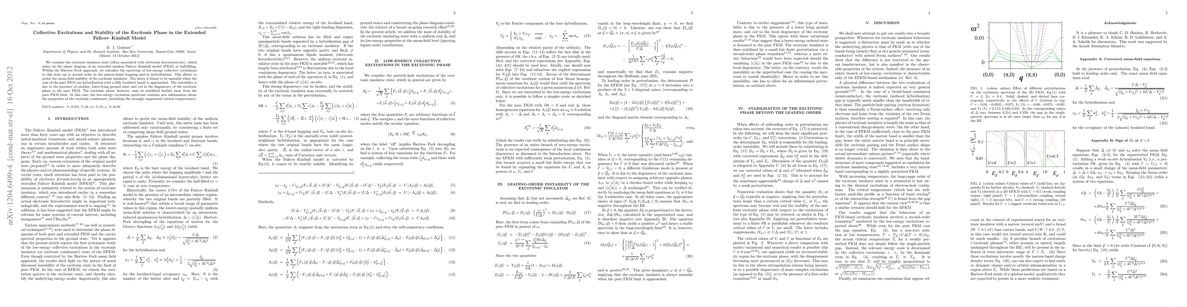 We consider the excitonic insulator state (often associated with electronic ferroelectricity), which arises on the phase diagram of an extended spinless Falicov--Kimball model (FKM) at half-filling. Within the Hartree--Fock approach, we calculate the spectrum of low-energy collective excitations in this state up to second order in the narrow-band hopping and/or hybridisation. This allows to probe the mean-field stability of the excitonic insulator. The latter is found to be unstable when the case of the pure FKM (no hybridisation with a fully localised band) is approached. The instability is due to the presence of another, lower-lying ground state and not to the degeneracy of the excitonic phase in the pure FKM. The excitonic phase, however, may be stabilised further away from the pure FKM limit. In this case, the low-energy excitation spectrum contains new information about the properties of the excitonic condensate (including the strongly suppressed critical temperature).