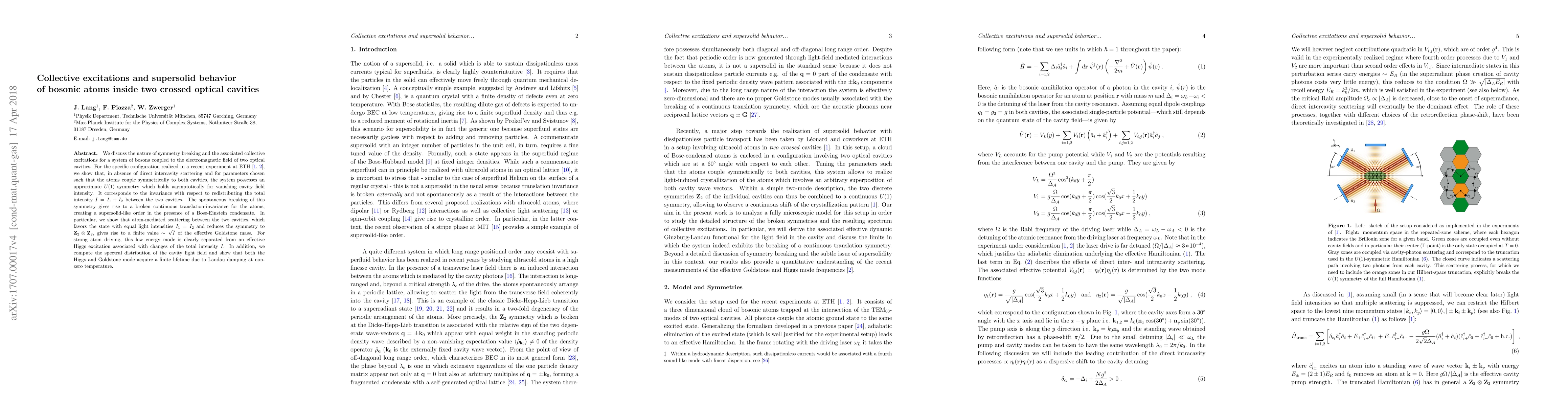 We discuss the nature of symmetry breaking and the associated collective excitations for a system of bosons coupled to the electromagnetic field of two optical cavities. For the specific configuration realized in a recent experiment at ETH, we show that, in absence of direct intercavity scattering and for parameters chosen such that the atoms couple symmetrically to both cavities, the system possesses an approximate $U(1)$ symmetry which holds asymptotically for vanishing cavity field intensity. It corresponds to the invariance with respect to redistributing the total intensity $I=I_1+I_2$ between the two cavities. The spontaneous breaking of this symmetry gives rise to a broken continuous translation-invariance for the atoms, creating a supersolid-like order in the presence of a Bose-Einstein condensate. In particular, we show that atom-mediated scattering between the two cavities, which favors the state with equal light intensities $I_1=I_2$ and reduces the symmetry to $\mathbf{Z}_2\otimes \mathbf{Z}_2$, gives rise to a finite value $\sim \sqrt{I}$ of the effective Goldstone mass. For strong atom driving, this low energy mode is clearly separated from an effective Higgs excitation associated with changes of the total intensity $I$. In addition, we compute the spectral distribution of the cavity light field and show that both the Higgs and Goldstone mode acquire a finite lifetime due to Landau damping at non-zero temperature.