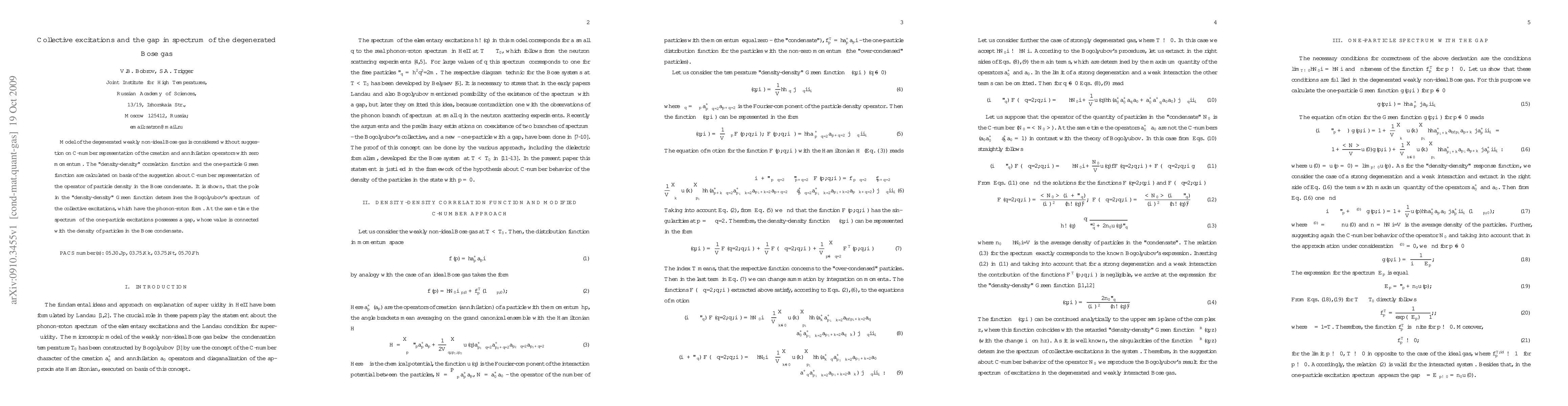 This paper investigates the collective excitations and spectral gap in a degenerate weakly non-ideal Bose gas, revealing that the "density-density" Green function's pole corresponds to Bogolyubov's phonon-roton spectrum, while the one-particle excitations exhibit a gap related to the particle density in the Bose condensate.