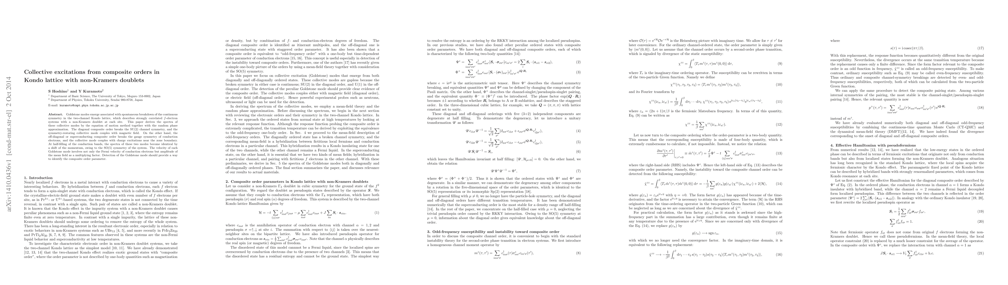 This paper investigates Goldstone modes arising from spontaneous symmetry breakdown in a Kondo lattice with non-Kramers doublets, revealing their spectra via the equation of motion and random phase approximation. The study identifies distinct coupling behaviors for diagonal and off-diagonal composite orders, with the latter linked to charge excitations and the former to magnetic fields.