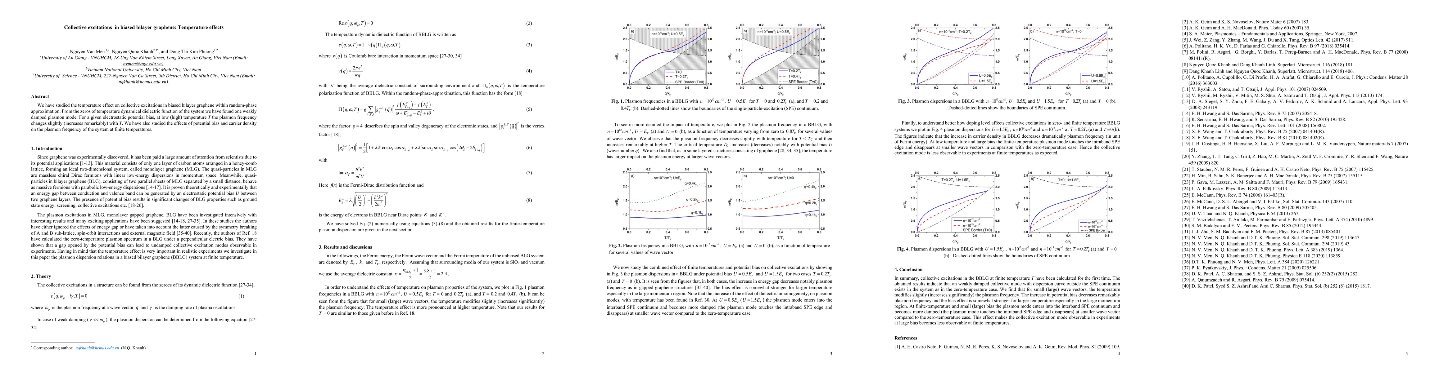 Summary: This study investigates the temperature effects on collective excitations in biased bilayer graphene, revealing a weakly damped plasmon mode whose frequency increases notably with rising temperature under potential bias, while also examining the influence of bias and carrier density on the plasmon frequency.
