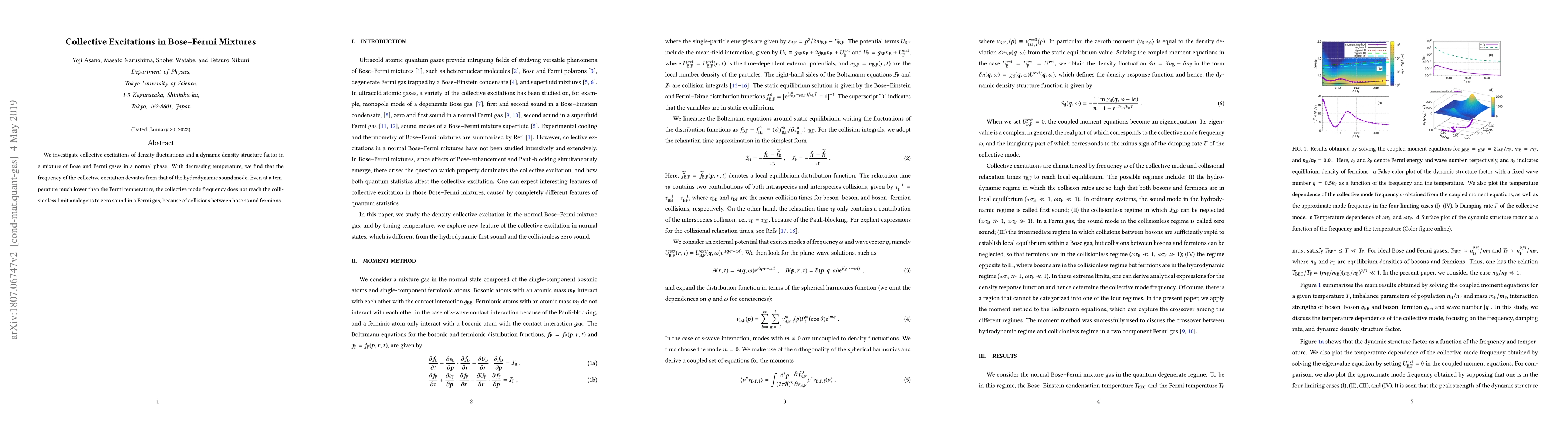 Summary: The study explores collective excitations in Bose-Fermi mixtures, revealing that the frequency of density fluctuations deviates from the hydrodynamic sound mode and does not reach the collisionless limit due to ongoing boson-fermion collisions, even at low temperatures.