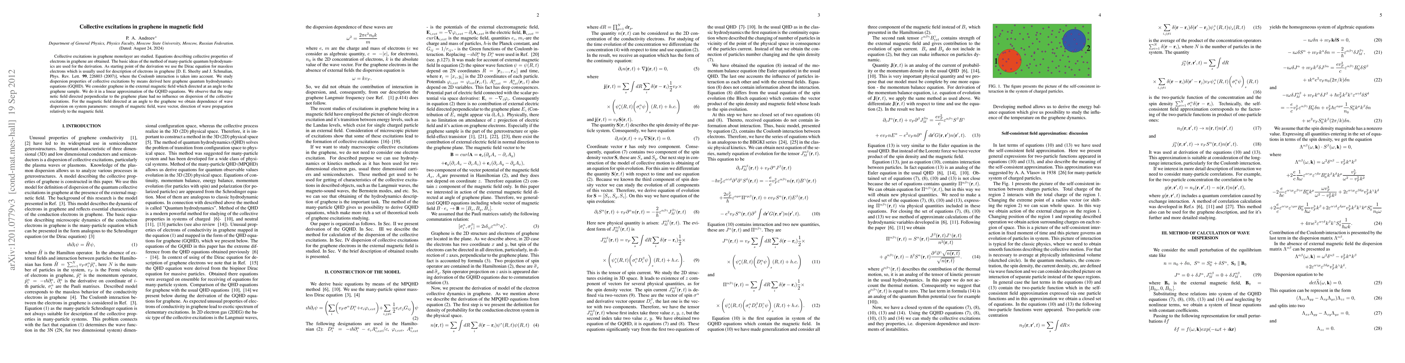Collective excitations in graphene monolayer are studied. Equations describing collective properties of electrons in graphene are obtained. The basic ideas of the method of many-particle quantum hydrodynamics are used for the derivation. As starting point of the derivation we use the Dirac equation for massless electrons which is usually used for description of electrons in graphene [D. E. Sheehy and J. Schmalian, Phys. Rev. Lett. 99, 226803 (2007)], where the Coulomb interaction is taken into account. We study dispersion properties of collective excitations by means derived here graphene quantum hydrodynamics equations (GQHD). We consider graphene in the external magnetic field which directed at an angle to the graphene sample. We do it in a linear approximation of the GQHD equations. We observe that the magnetic field directed perpendicular to the graphene plane had no influence on dispersion of the collective excitations. For the magnetic field directed at an angle to the graphene we obtain dependence of wave dispersion on system parameters: strength of magnetic field, wave vector, direction of wave propagation relatively to the magnetic field.