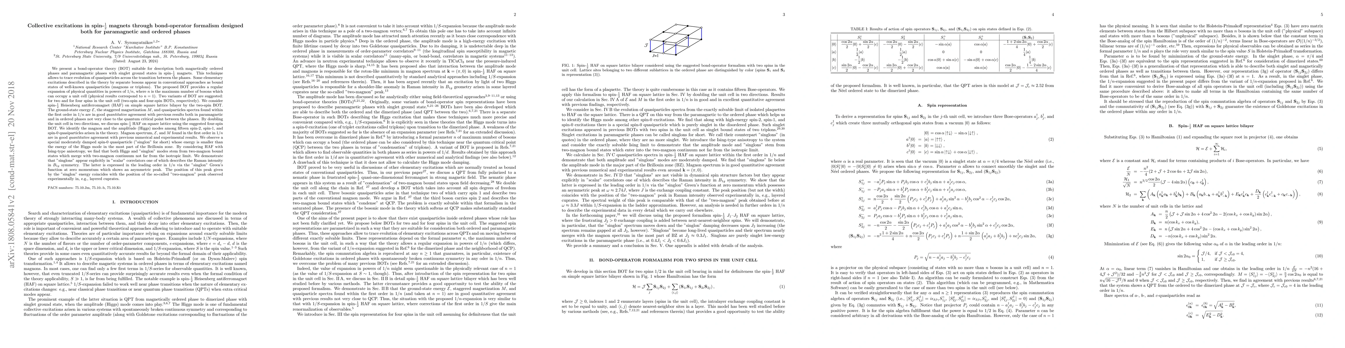 We present a bond-operator theory (BOT) suitable for description both magnetically ordered phases and paramagnetic phases with singlet ground states in spin-1/2 magnets. Proposed BOT provides a regular expansion of physical quantities in powers of 1/n, where n is the maximum number of bosons which can occupy a unit cell (physical results correspond to n=1). Two variants of BOT are suggested: for two and for four spins in the unit cell (two-spin and four-spin BOTs, respectively). We consider spin-1/2 Heisenberg antiferromagnet (HAF) on simple square lattice bilayer by the two-spin BOT. Ground-state energy E, staggered magnetization M, and quasiparticles spectra found within the first order in 1/n are in good quantitative agreement with previous results both in paramagnetic and in ordered phases not very close to the quantum critical point between the phases. By doubling the unit cell in two directions, we discuss spin-1/2 HAF on square lattice using the suggested four-spin BOT. Magnon spectrum, E, and M found in the first order in 1/n are in good quantitative agreement with previous numerical and experimental results. We observe a special moderately damped spin-0 quasiparticle ("singlon" for short) whose energy is smaller than the energy of the Higgs mode in the most part of the Brillouin zone. By considering HAF with Izing-type anisotropy, we find that both Higgs and "singlon" modes stem from two-magnon bound states which merge with two-magnon continuum not far from the isotropic limit. We demonstrate that "singlons" appear explicitly in "scalar" correlators one of which describes the Raman intensity in $B_{1g}$ symmetry. The latter is expressed in the leading order in 1/n via the "singlon" Green's function at zero momentum which shows an asymmetric peak. The position of this peak coincides with the position of "two-magnon" peak observed experimentally in, e.g., layered cuprates.