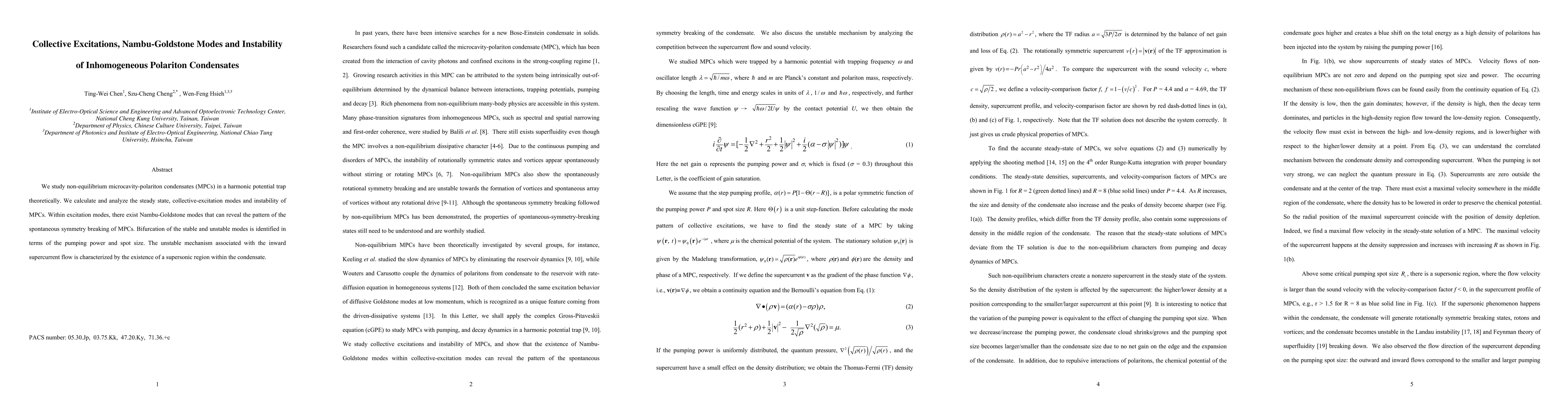 This paper theoretically investigates non-equilibrium microcavity-polariton condensates in a harmonic trap, analyzing their steady state, collective excitation modes, and instabilities. It identifies Nambu-Goldstone modes indicating spontaneous symmetry breaking and characterizes bifurcations in stable and unstable modes linked to pumping power and spot size, revealing a supersonic region due to inward supercurrent flow.