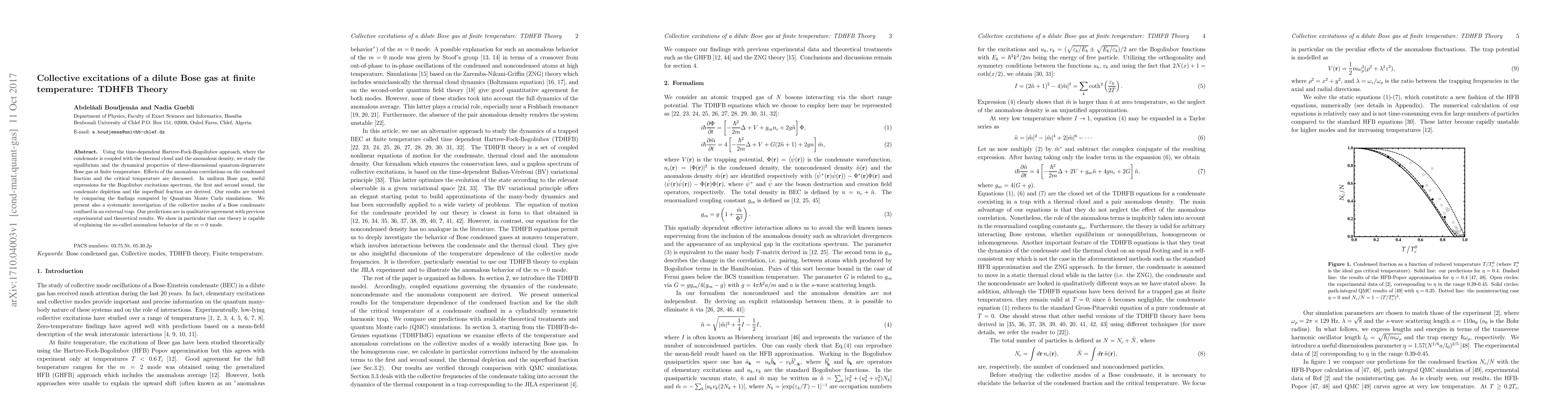 This paper explores the equilibrium and dynamical properties of a three-dimensional Bose gas at finite temperature using the time-dependent Hartree-Fock-Bogoliubov approach. It derives expressions for Bogoliubov excitations, sound modes, and superfluid fraction, and compares theoretical predictions with Quantum Monte Carlo simulations and experimental data, explaining anomalous behaviors in collective modes.