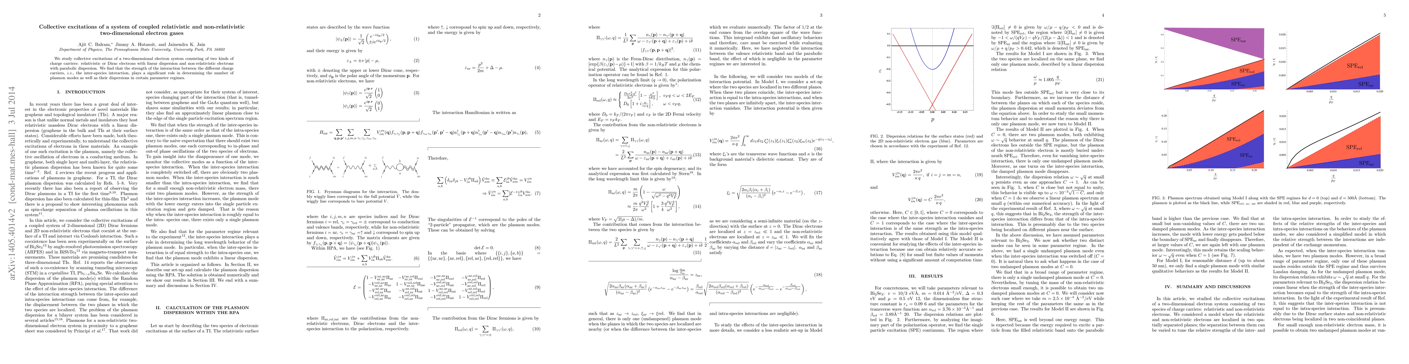 We study collective excitations of a two-dimensional electron system consisting of two kinds of charge carriers: relativistic or Dirac electrons with linear dispersion and non-relativistic electrons with parabolic dispersion. We find that the strength of the interaction between the different charge carriers, i.e., the inter-species interaction, plays a significant role in determining the number of plasmon modes as well as their dispersions in certain parameter regimes.