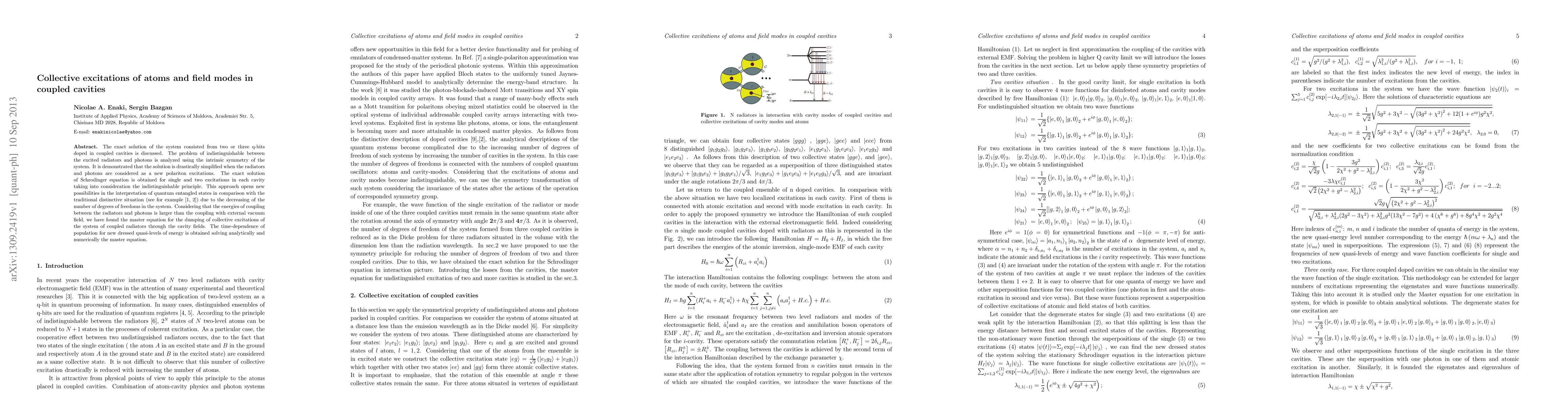 The exact solution of the system consisted from two or three q-bits doped in coupled cavities is discussed. The problem of indistinguishable between the excited radiators and photons is analyzed using the intrinsic symmetry of the system. It is demonstrated that the solution is drastically simplified when the radiators and photons are considered as a new polariton excitations. The exact solution of Schrodinger equation is obtained for single and two excitations in each cavity taking into consideration the indistinguishable principle. This approach opens new possibilities in the interpretation of quantum entangled states in comparison with the traditional distinctive situation (see for example [1,2]) due to the decreasing of the number of degrees of freedoms in the system. Considering that the energies of coupling between the radiators and photons is larger than the coupling with external vacuum field, we have found the master equation for the dumping of collective excitations of the system of coupled radiators through the cavity fields. The time-dependence of population for new dressed quasi-levels of energy is obtained solving analytically and numerically the master equation.