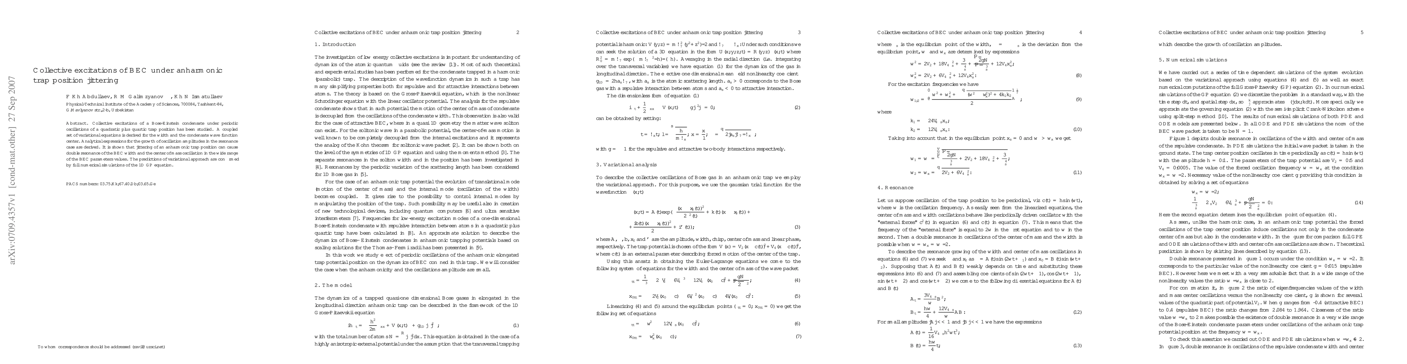 Collective excitations of a Bose-Einstein condensate under periodic oscillations of a quadratic plus quartic trap position has been studied. A coupled set of variational equations is derived for the width and the condensate wave function center. Analytical expressions for the growth of oscillation amplitudes in the resonance case are derived. It is shown that jittering of an anharmonic trap position can cause double resonance of the BEC width and the center of mass oscillation in the wide range of the BEC parameters values. The predictions of variational approach are confirmed by full numerical simulations of the 1D GP equation.