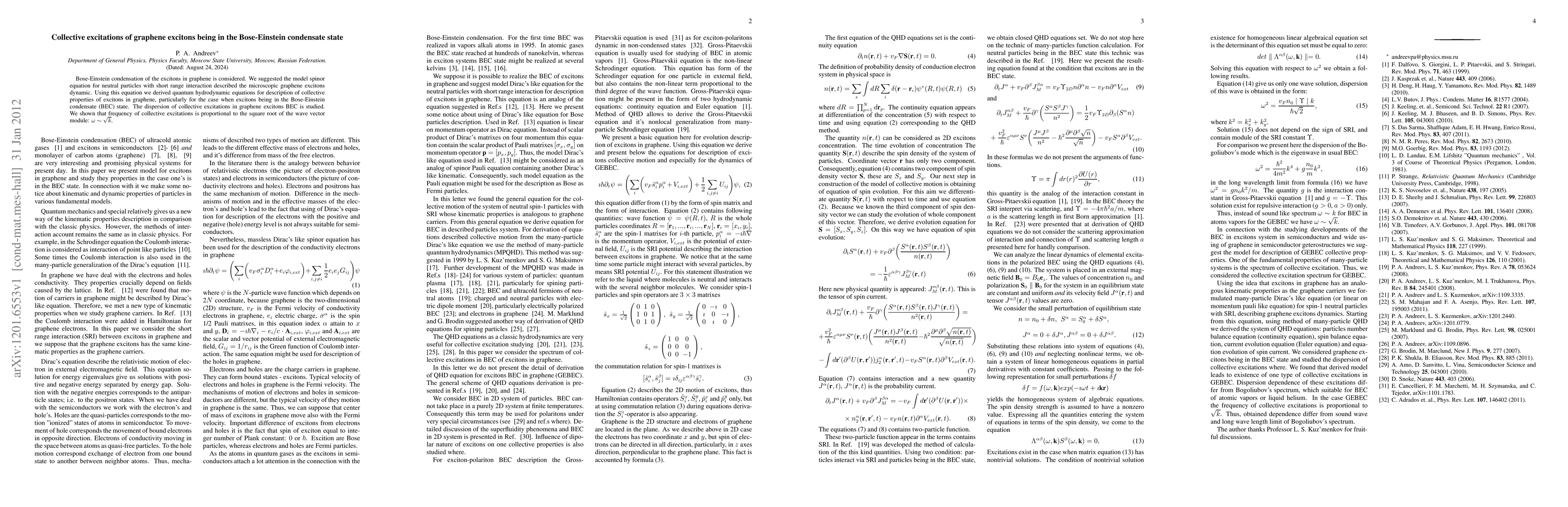 This paper explores the Bose-Einstein condensation of graphene excitons and proposes a spinor equation to describe their dynamics. It derives quantum hydrodynamic equations to analyze collective excitations in the BEC state, revealing that the excitation frequency is proportional to the square root of the wave vector.