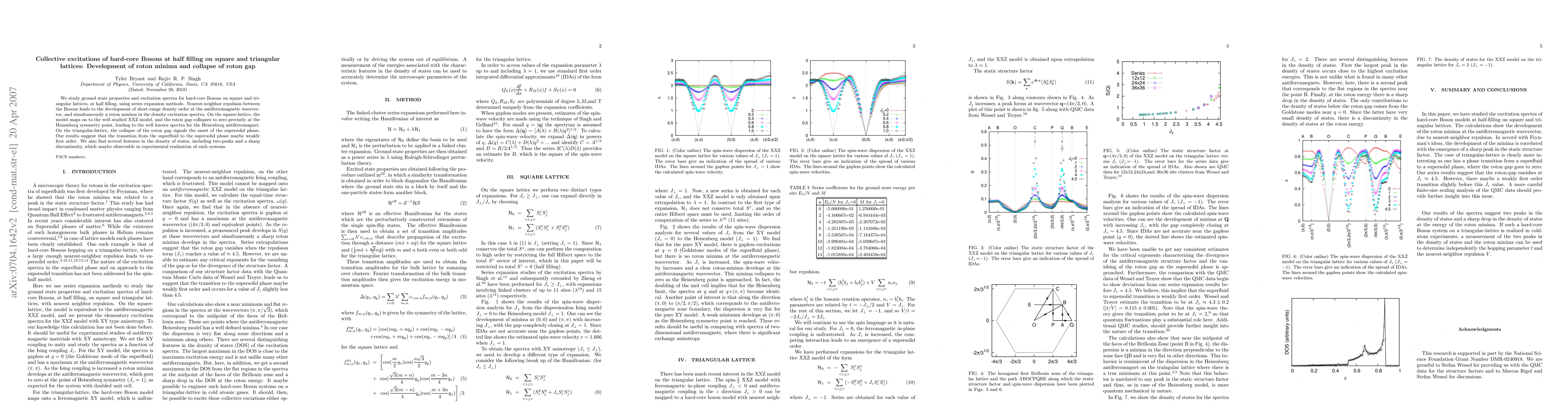 This paper investigates the excitation spectra of hard-core Bosons on square and triangular lattices at half filling, revealing the emergence of roton minima and the collapse of the roton gap, which signals the transition to a supersolid phase on the triangular lattice. The study suggests a weakly first-order transition from superfluid to supersolid phase and identifies observable features in the density of states.