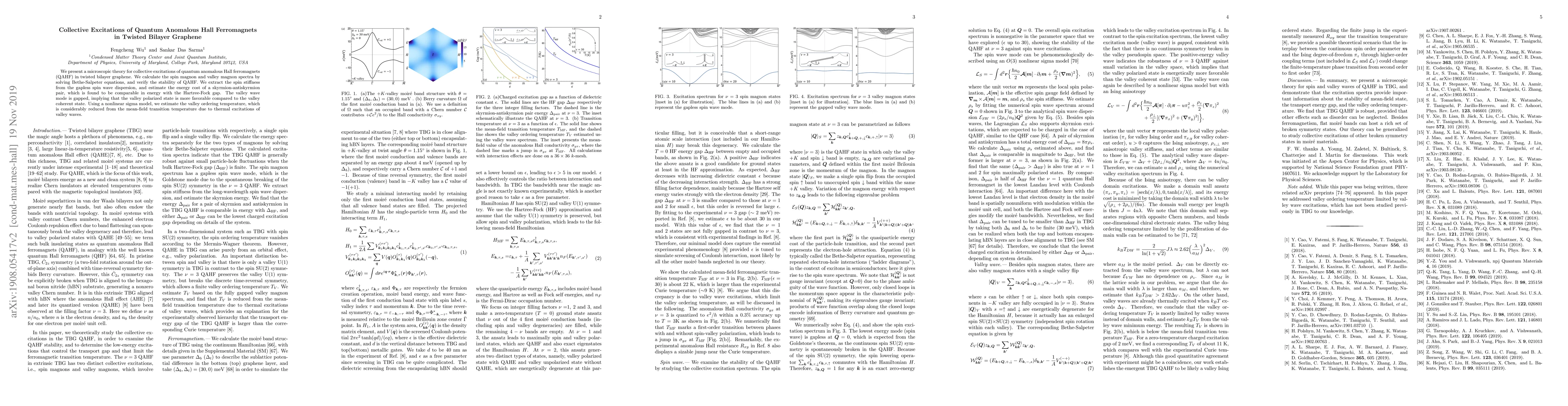 This study develops a microscopic theory to analyze collective excitations in quantum anomalous Hall ferromagnets within twisted bilayer graphene, calculating spin and valley magnon spectra and verifying the stability of the QAHF state. It finds the valley wave mode to be gapped, suggesting a more favorable valley polarized state.