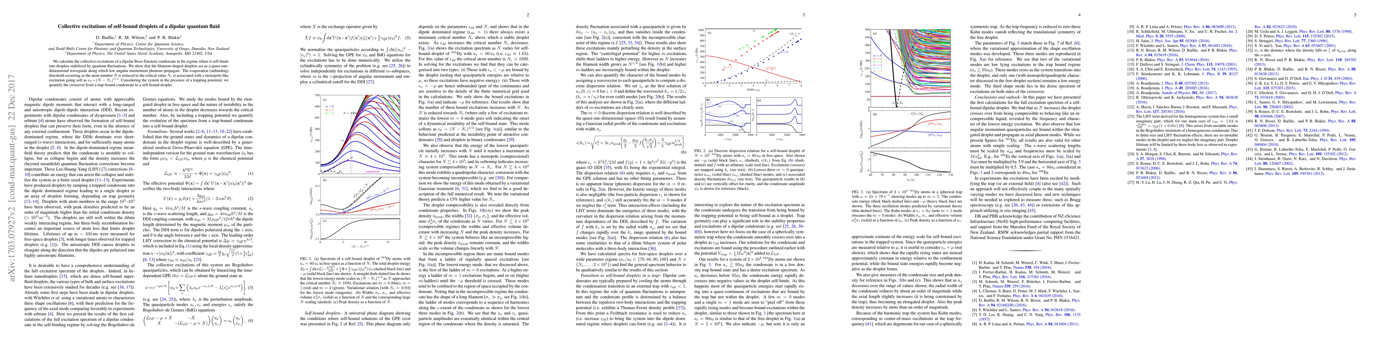 We calculate the collective excitations of a dipolar Bose-Einstein condensate in the regime where it self-binds into droplets stabilized by quantum fluctuations. We show that the filament-shaped droplets act as a quasi-one-dimensional waveguide along which low angular momentum phonons propagate. The evaporation (unbinding) threshold occurring as the atom number $N$ is reduced to the critical value $N_c$ is associated with a monopole-like excitation going soft as $\epsilon_0\sim(N-N_c)^{1/4}$. Considering the system in the presence of a trapping potential, we quantify the crossover from a trap-bound condensate to a self-bound droplet.