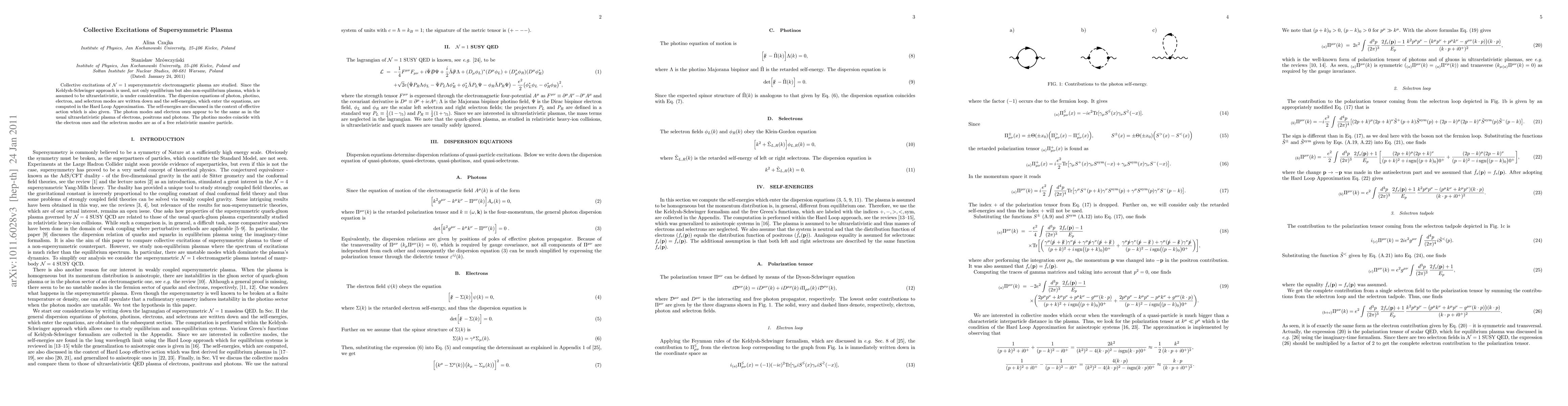 Collective excitations of N = 1 supersymmetric electromagnetic plasma are studied. Since the Keldysh-Schwinger approach is used, not only equilibrium but also non-equilibrium plasma, which is assumed to be ultrarelativistic, is under consideration. The dispersion equations of photon, photino, electron and selectron modes are written down and the self-energies, which enter the equations, are computed in the Hard Loop Approximation. The self-energies are discussed in the context of effective action which is also given. The photon modes and electron ones appear to be the same as in the usual ultrarelativistic plasma of electrons, positrons and photons. The photino modes coincide with the electron ones and the selectron modes are as of free relativistic massive particle.