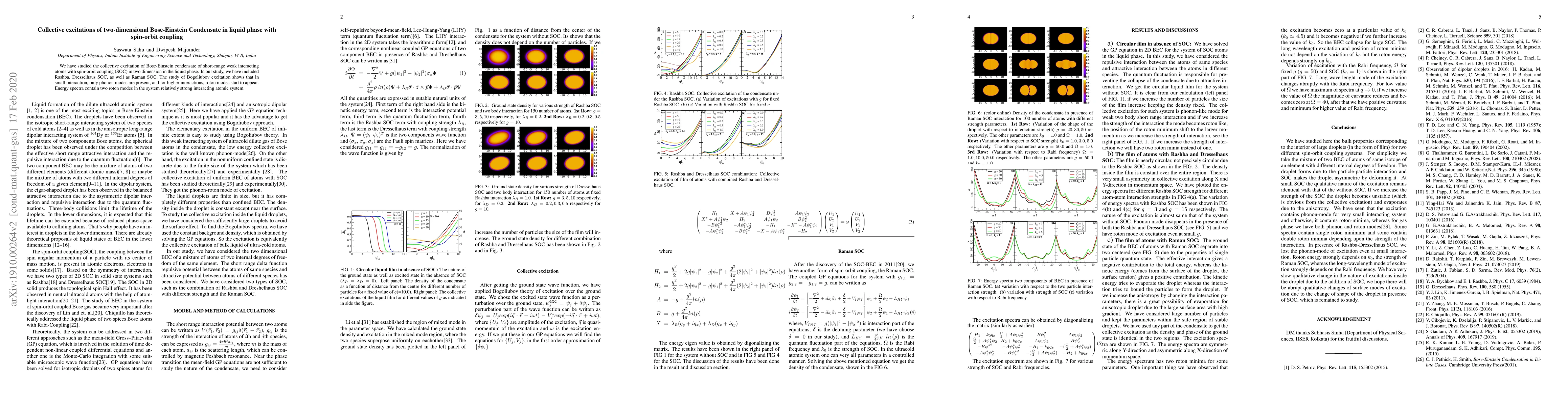 We have studied the collective excitation of Bose-Einstein condensate of short range weak interacting atoms with spin-orbit coupling (SOC) in two dimension in liquid phase. In our study, we have included Rashba, Dresselhaus SOC as well as Raman SOC. The study of Bogoliubov excitation shows that in small interaction case only phonon modes are present and for higher interactions roton modes start to appear. Energy spectra contain two roton modes in the system relatively strong interacting atomic system.