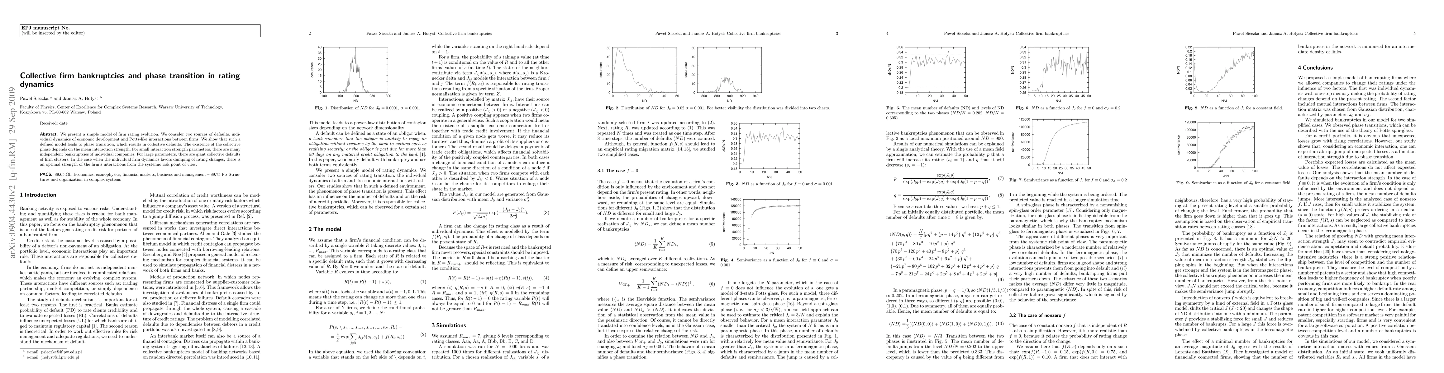 We present a simple model of firm rating evolution. We consider two sources of defaults: individual dynamics of economic development and Potts-like interactions between firms. We show that such a defined model leads to phase transition, which results in collective defaults. The existence of the collective phase depends on the mean interaction strength. For small interaction strength parameters, there are many independent bankruptcies of individual companies. For large parameters, there are giant collective defaults of firm clusters. In the case when the individual firm dynamics favors dumping of rating changes, there is an optimal strength of the firm's interactions from the systemic risk point of view.