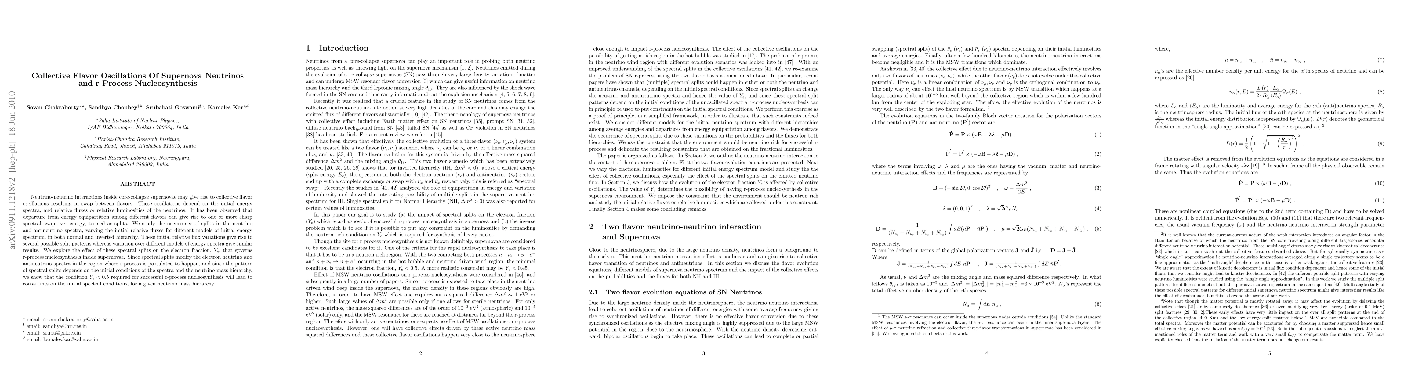 The study investigates collective flavor oscillations of supernova neutrinos, focusing on spectral splits and their impact on r-process nucleosynthesis. It varies initial relative fluxes for different energy spectrum models in both normal and inverted hierarchies.