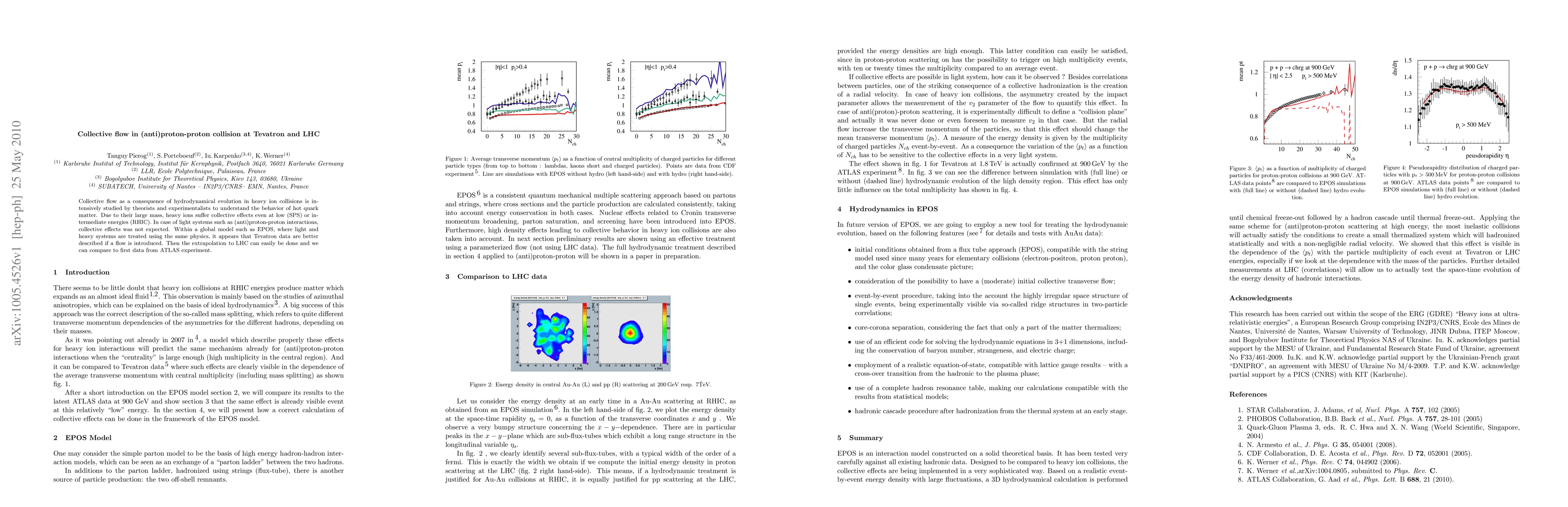 Collective flow as a consequence of hydrodynamical evolution in heavy ion collisions is intensively studied by theorists and experimentalists to understand the behavior of hot quark matter. Due to their large mass, heavy ions suffer collective effects even at low (SPS) or intermediate energies (RHIC). In case of light systems such as (anti)proton-proton interactions, collective effects was not expected. Within a global model such as EPOS, where light and heavy systems are treated using the same physics, it appears that Tevatron data are better described if a flow is introduced. Then the extrapolation to LHC can easily be done and we can compare to first data from ATLAS experiment.