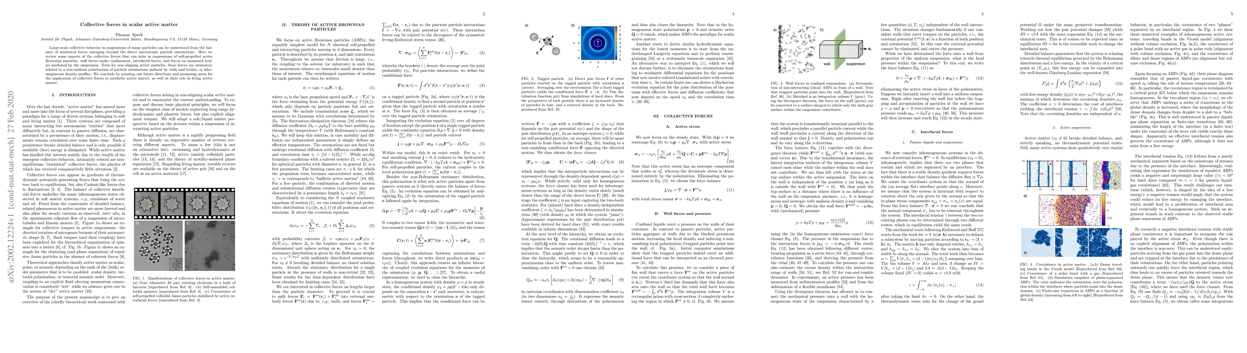 This paper reviews collective forces in suspensions of self-propelled active Brownian particles, focusing on wall, interfacial, and body-mediated forces. It highlights how these forces arise from non-uniform polarization and density profiles, and suggests future applications in synthetic and living active matter.