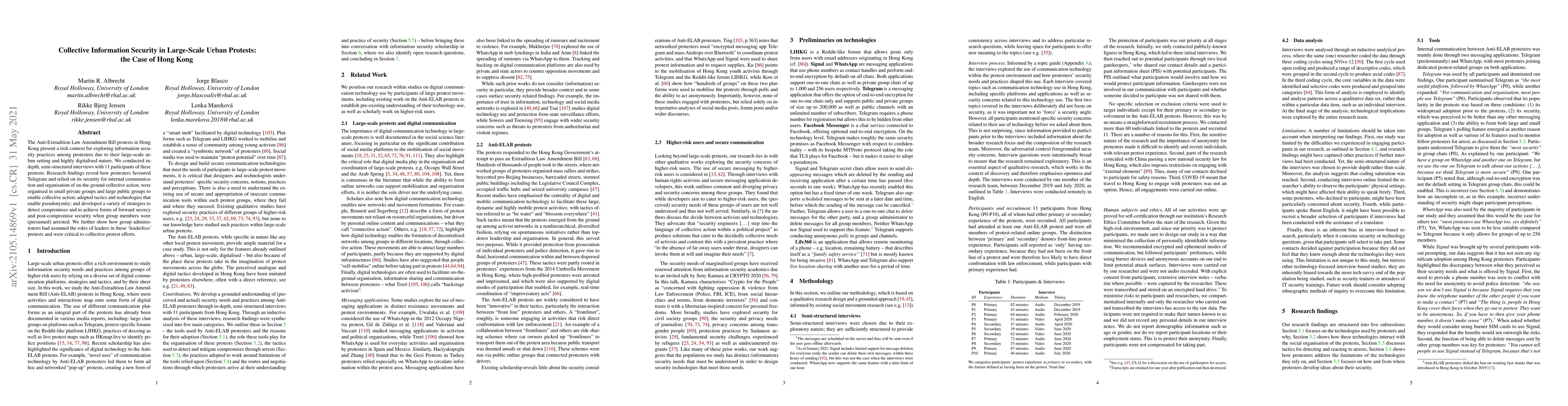 The Anti-Extradition Law Amendment Bill protests in Hong Kong present a rich context for exploring information security practices among protesters due to their large-scale urban setting and highly digitalised nature. We conducted in-depth, semi-structured interviews with 11 participants of these protests. Research findings reveal how protesters favoured Telegram and relied on its security for internal communication and organisation of on-the-ground collective action; were organised in small private groups and large public groups to enable collective action; adopted tactics and technologies that enable pseudonymity; and developed a variety of strategies to detect compromises and to achieve forms of forward secrecy and post-compromise security when group members were (presumed) arrested. We further show how group administrators had assumed the roles of leaders in these 'leaderless' protests and were critical to collective protest efforts.