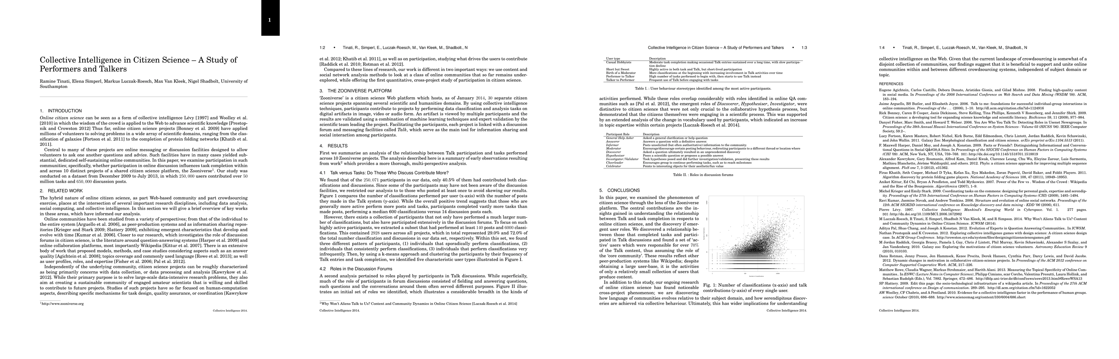 The recent emergence of online citizen science is illustrative of an efficient and effective means to harness the crowd in order to achieve a range of scientific discoveries. Fundamentally, citizen science projects draw upon crowds of non-expert volunteers to complete short Tasks, which can vary in domain and complexity. However, unlike most human-computational systems, participants in these systems, the `citizen scientists' are volunteers, whereby no incentives, financial or otherwise, are offered. Furthermore, encouraged by citizen science platforms such as Zooniverse, online communities have emerged, providing them with an environment to discuss, share ideas, and solve problems. In fact, it is the result of these forums that has enabled a number of scientific discoveries to be made. In this paper we explore the phenomenon of collective intelligence via the relationship between the activities of online citizen science communities and the discovery of scientific knowledge. We perform a cross-project analysis of ten Zooniverse citizen science projects and analyse the behaviour of users with regards to their Task completion activity and participation in discussion and discover collective behaviour amongst highly active users. Whilst our findings have implications for future citizen science design, we also consider the wider implications for understanding collective intelligence research in general.