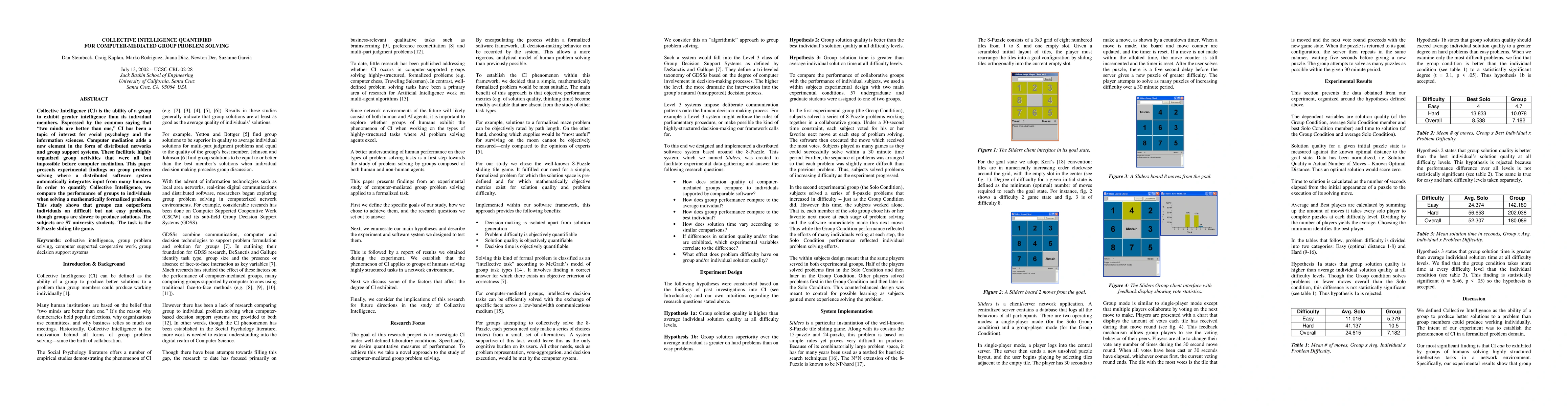 Collective Intelligence (CI) is the ability of a group to exhibit greater intelligence than its individual members. Expressed by the common saying that "two minds are better than one," CI has been a topic of interest for social psychology and the information sciences. Computer mediation adds a new element in the form of distributed networks and group support systems. These facilitate highly organized group activities that were all but impossible before computer mediation. This paper presents experimental findings on group problem solving where a distributed software system automatically integrates input from many humans. In order to quantify Collective Intelligence, we compare the performance of groups to individuals when solving a mathematically formalized problem. This study shows that groups can outperform individuals on difficult but not easy problems, though groups are slower to produce solutions. The subjects are 57 university students. The task is the 8-Puzzle sliding tile game.
