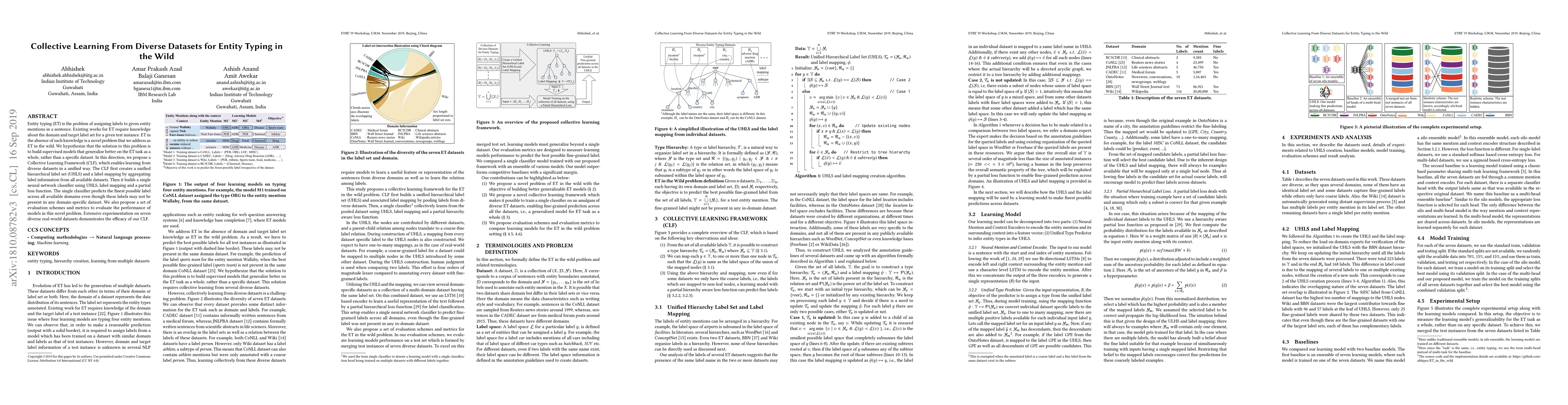 Entity typing (ET) is the problem of assigning labels to given entity mentions in a sentence. Existing works for ET require knowledge about the domain and target label set for a given test instance. ET in the absence of such knowledge is a novel problem that we address as ET in the wild. We hypothesize that the solution to this problem is to build supervised models that generalize better on the ET task as a whole, rather than a specific dataset. In this direction, we propose a Collective Learning Framework (CLF), which enables learning from diverse datasets in a unified way. The CLF first creates a unified hierarchical label set (UHLS) and a label mapping by aggregating label information from all available datasets. Then it builds a single neural network classifier using UHLS, label mapping, and a partial loss function. The single classifier predicts the finest possible label across all available domains even though these labels may not be present in any domain-specific dataset. We also propose a set of evaluation schemes and metrics to evaluate the performance of models in this novel problem. Extensive experimentation on seven diverse real-world datasets demonstrates the efficacy of our CLF.