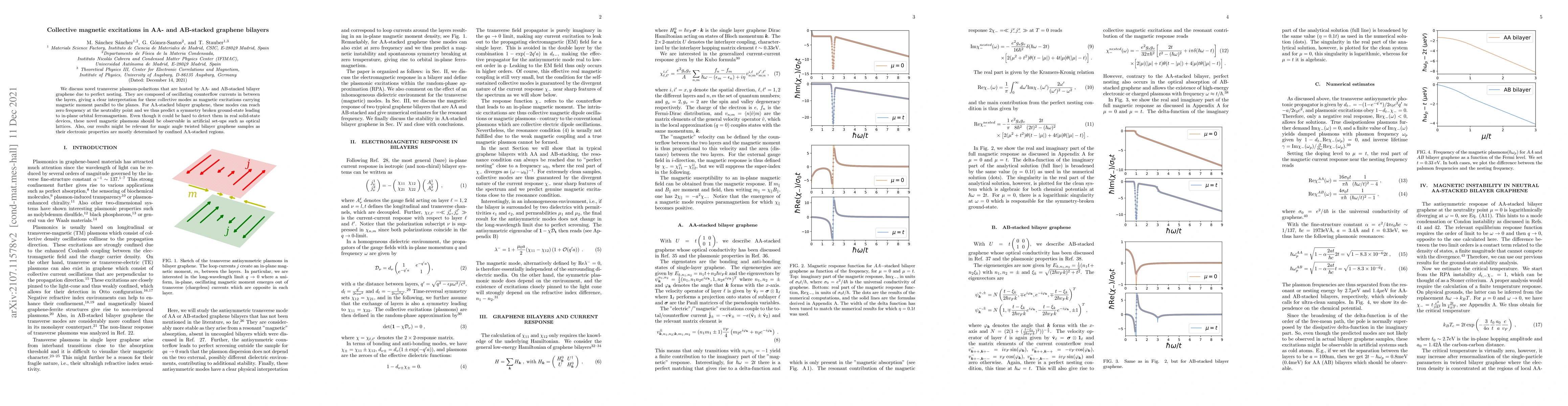 We discuss novel transverse plasmon-polaritons that are hosted by AA- and AB-stacked bilayer graphene due to perfect nesting. They are composed of oscillating counterflow currents in between the layers, giving a clear interpretation for these collective modes as magnetic excitations carrying magnetic moment parallel to the planes. For AA-stacked bilayer graphene, these modes can reach zero frequency at the neutrality point and we thus predict a symmetry broken ground-state leading to in-plane orbital ferromagnetism. Even though it could be hard to detect them in real solid-state devices, these novel magnetic plasmons should be observable in artificial set-ups such as optical lattices. Also, our results might be relevant for magic angle twisted bilayer graphene samples as their electronic properties are mostly determined by confined AA-stacked regions.