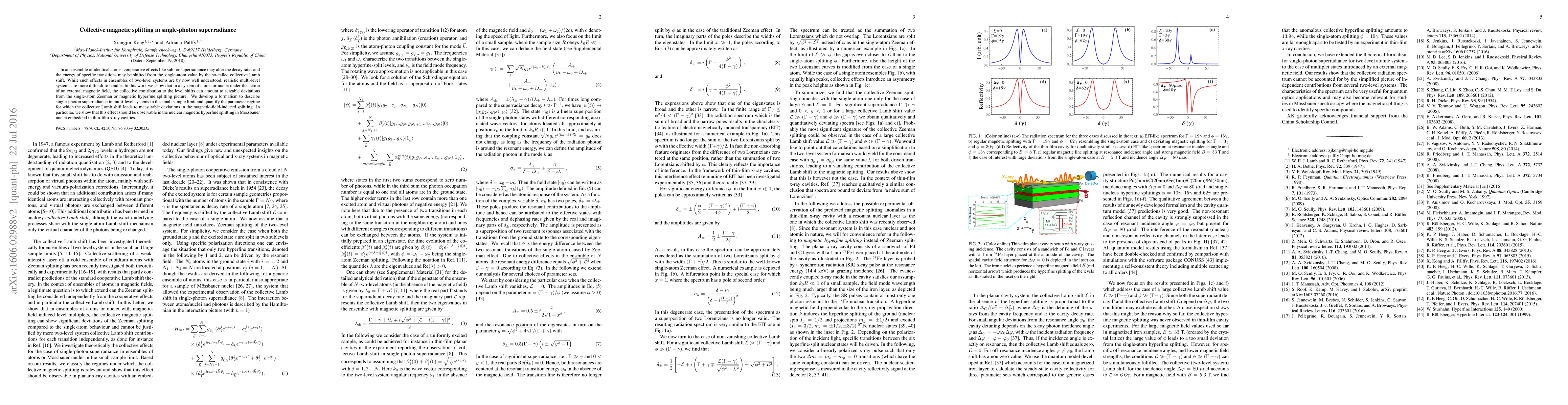 This paper investigates the collective magnetic splitting in single-photon superradiance within multi-level atomic or nuclear systems, demonstrating significant deviations from single-atom Zeeman splitting due to the collective Lamb shift. The study develops a formalism for describing these effects and predicts observable shifts in nuclear magnetic hyperfine splitting in Mössbauer nuclei in thin-film x-ray cavities.