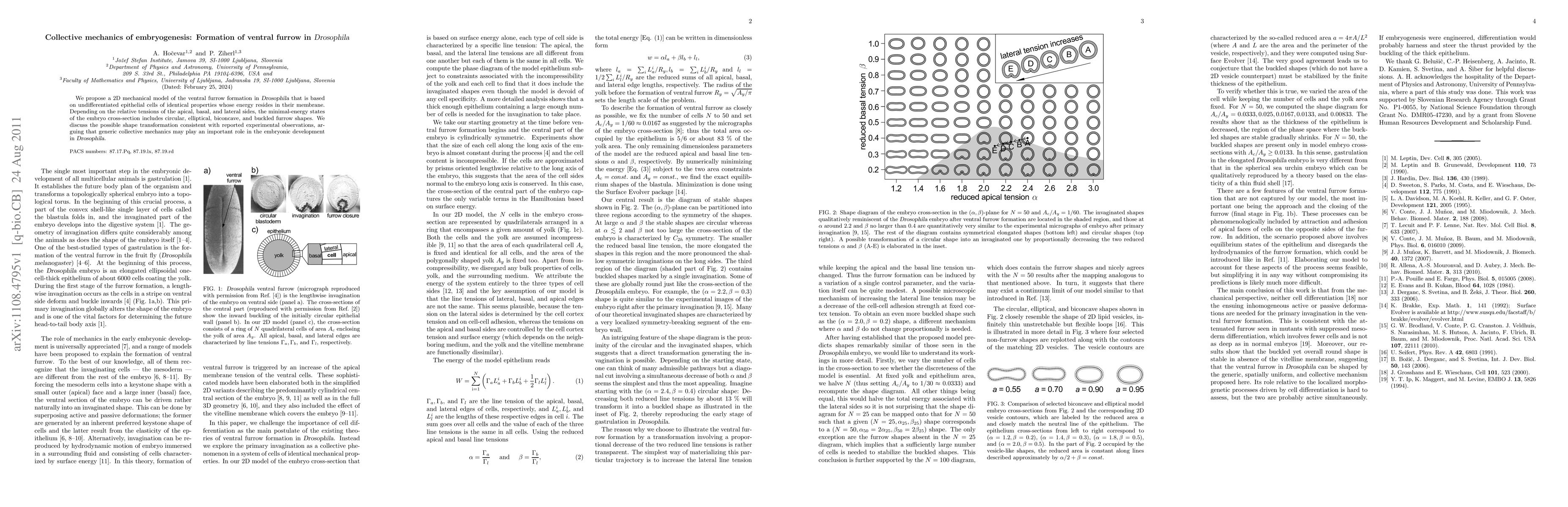 This research proposes a 2D mechanical model for ventral furrow formation in Drosophila embryos, based on undifferentiated cells with energy in their membrane. The model identifies circular, elliptical, biconcave, and buckled furrow shapes as minimal-energy states, depending on apical, basal, and lateral tensions. The study suggests that collective mechanics could be crucial in Drosophila embryonic development.