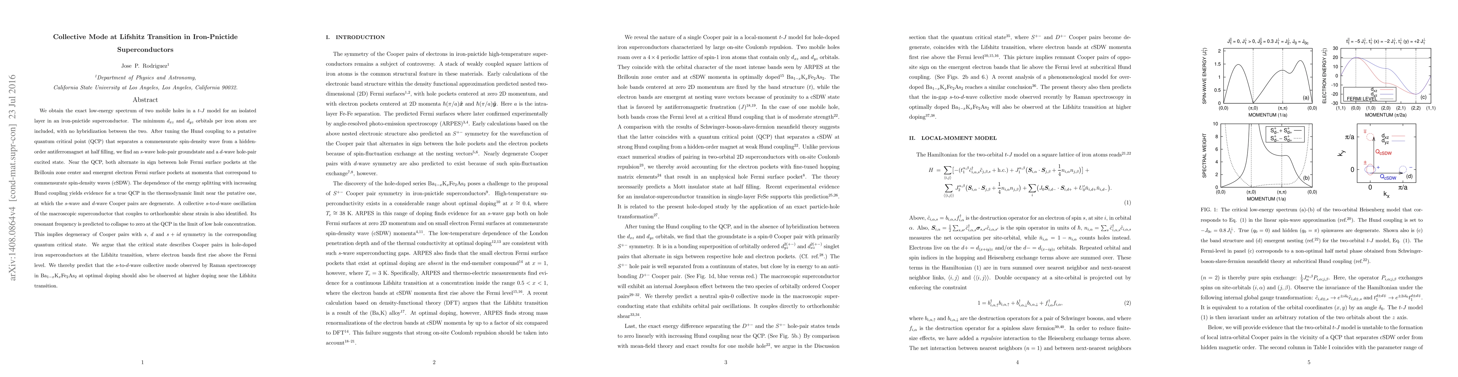 We obtain the exact low-energy spectrum of two mobile holes in a t-J model for an isolated layer in an iron-pnictide superconductor. The minimum d xz and d yz orbitals per iron atom are included, with no hybridization between the two. After tuning the Hund coupling to a putative quantum critical point (QCP) that separates a commensurate spin-density wave from a hidden-order antiferromagnet at half filling, we find an s-wave hole-pair groundstate and a d-wave hole-pair excited state. Near the QCP, both alternate in sign between hole Fermi surface pockets at the Brillouin zone center and emergent electron Fermi surface pockets at momenta that correspond to commensurate spin-density waves (cSDW). The dependence of the energy splitting with increasing Hund coupling yields evidence for a true QCP in the thermodynamic limit near the putative one, at which the s-wave and d-wave Cooper pairs are degenerate. A collective s-to-d-wave oscillation of the macroscopic superconductor that couples to orthorhombic shear strain is also identified. Its resonant frequency is predicted to collapse to zero at the QCP in the limit of low hole concentration. This implies degeneracy of Cooper pairs with s, d and s+id symmetry in the corresponding quantum critical state. We argue that the critical state describes Cooper pairs in hole-doped iron superconductors at the Lifshitz transition, where electron bands first rise above the Fermi level. We thereby predict that the s-to-d-wave collective mode observed by Raman spectroscopy in Ba1-xKxFe2As2 at optimal doping should also be observed at higher doping near the Lifshitz transition.