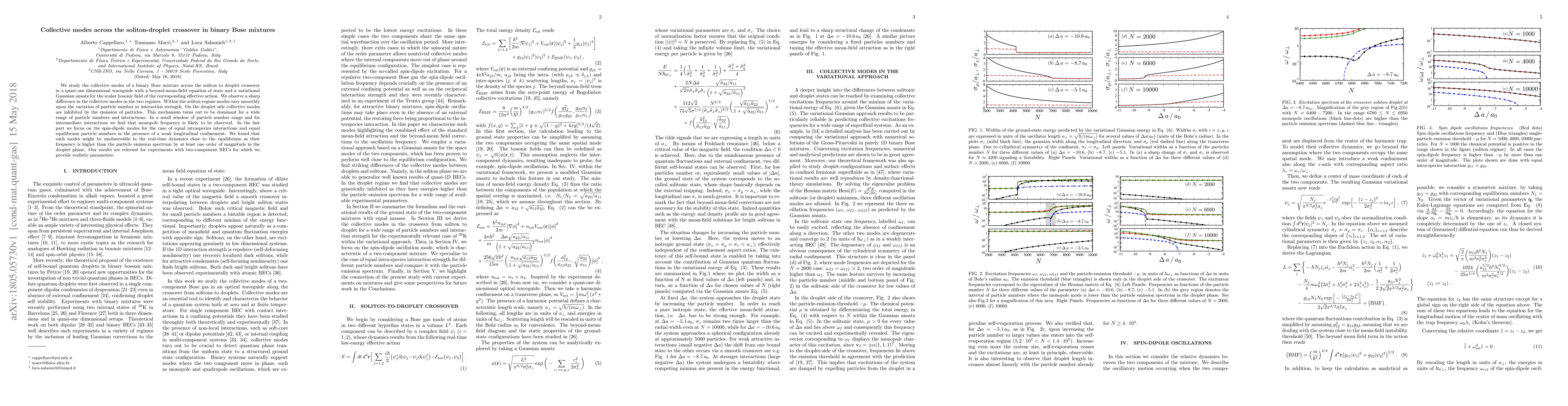 We study the collective modes of a binary Bose mixture across the soliton to droplet crossover in a quasi one dimensional waveguide with a beyond-mean-field equation of state and a variational Gaussian ansatz for the scalar bosonic field of the corresponding effective action. We observe a sharp difference in the collective modes in the two regimes. Within the soliton regime modes vary smoothly upon the variation of particle number or interaction strength. On the droplet side collective modes are inhibited by the emission of particles. This mechanism turns out to be dominant for a wide range of particle numbers and interactions. In a small window of particle number range and for intermediate interactions we find that monopole frequency is likely to be observed. In the last part we focus on the spin-dipole modes for the case of equal intraspecies interactions and equal equilibrium particle numbers in the presence of a weak longitudinal confinement. We found that such modes might be unobservable in the real-time dynamics close to the equilibrium as their frequency is higher than the particle emission spectrum by at least one order of magnitude in the droplet phase. Our results are relevant for experiments with two-component BECs for which we provide realistic parameters.