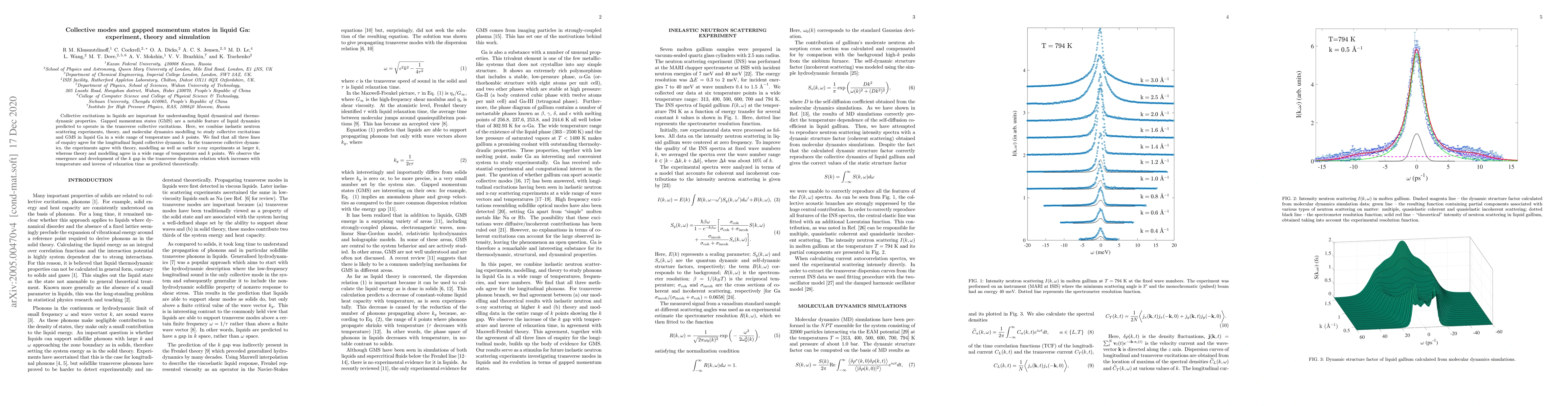 This paper combines experimental, theoretical, and simulation methods to study collective excitations and gapped momentum states in liquid Ga. The findings reveal consistent agreement across all approaches for the longitudinal sector, while the transverse sector shows experimental and theoretical alignment, highlighting the emergence of a temperature-dependent $k$-gap.