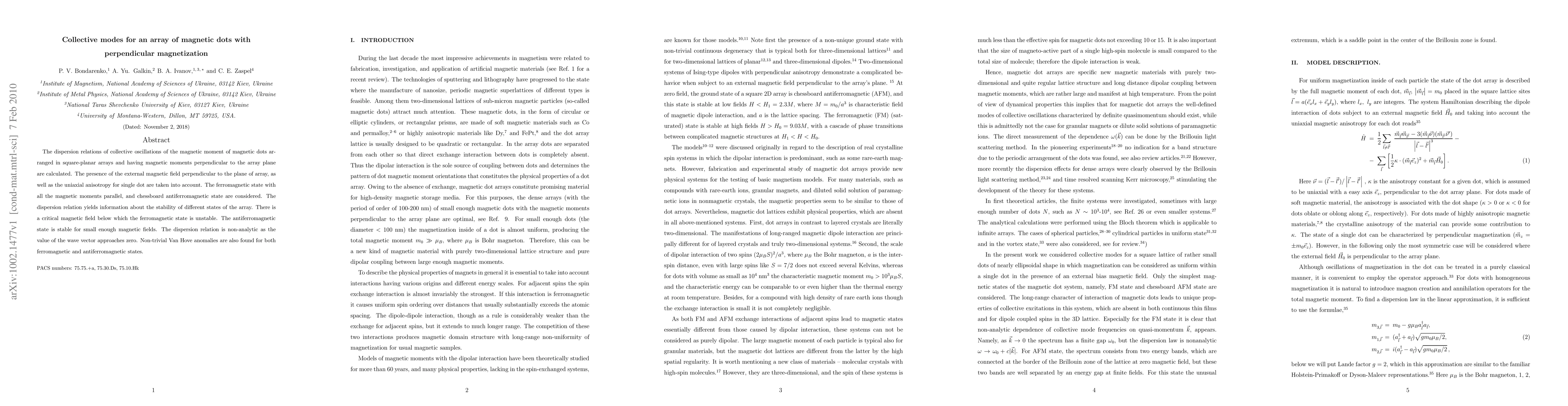 This paper calculates the dispersion relations for collective oscillations in arrays of magnetic dots with perpendicular magnetization, considering external magnetic fields and uniaxial anisotropy. It reveals critical magnetic field thresholds for stability between ferromagnetic and antiferromagnetic states, with non-trivial Van Hove anomalies observed in both states.