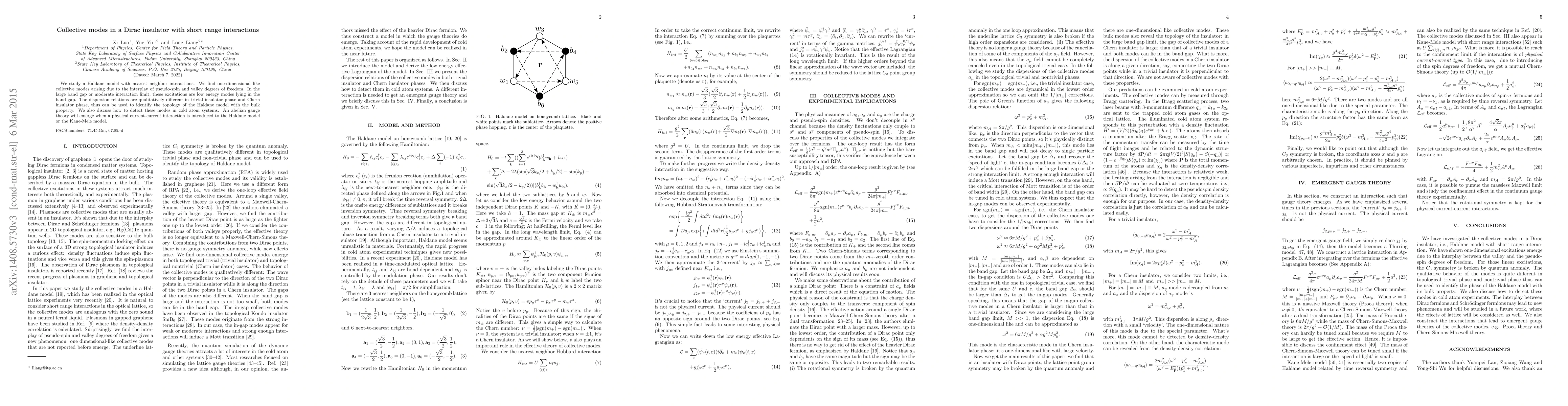 We study a Haldane model with nearest neighbor interactions. We find one-dimensional like collective modes arising due to the interplay of pseudo-spin and valley degrees of freedom. In the large band gap or moderate interaction limit, these excitations are low energy modes lying in the band gap. The dispersion relations are qualitatively different in trivial insulator phase and Chern insulator phase, thus can be used to identify the topology of the Haldane model with the bulk property. We also discuss how to detect these modes in cold atom systems. An abelian gauge theory will emerge when a physical current-current interaction is introduced to the Haldane model or the Kane-Mele model.