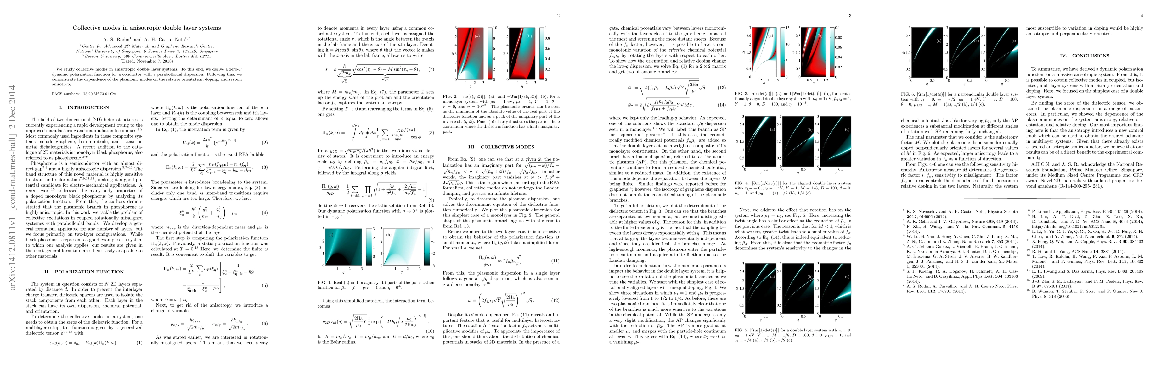This paper investigates collective modes in anisotropic double layer systems, deriving a zero-temperature dynamic polarization function for a conductor with paraboloidal dispersion. It examines how plasmonic modes are influenced by factors such as relative orientation, doping, and system anisotropy.