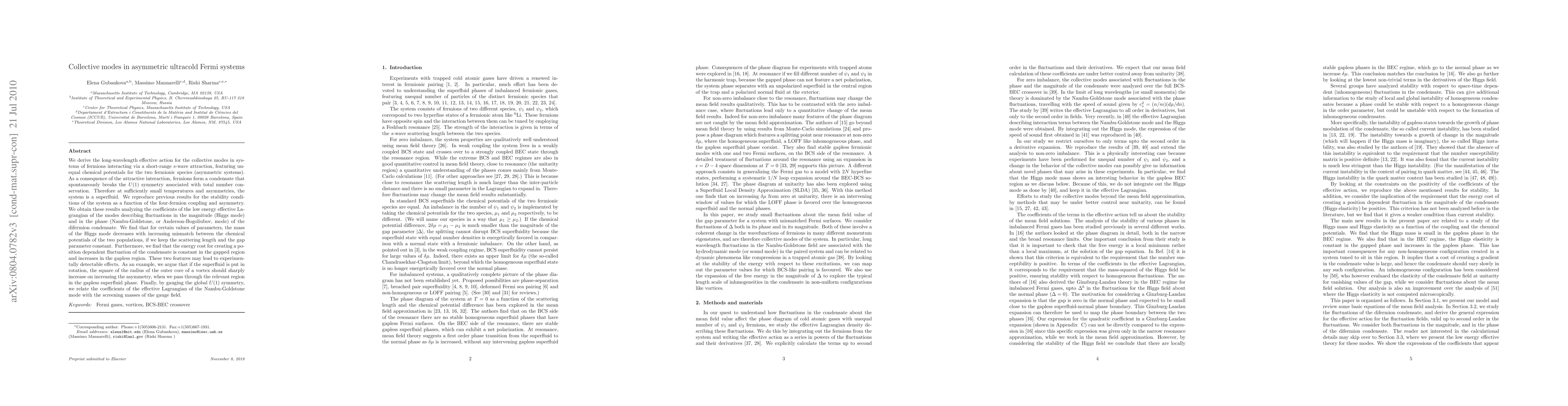 We derive the low energy effective action for the collective modes in systems of fermions interacting via a short-range s-wave attraction, featuring unequal chemical potentials for the two fermionic species (asymmetric systems). As a consequence of the attractive interaction, fermions form a condensate that spontaneously breaks the U(1) symmetry associated with total number conservation. Therefore at sufficiently small temperatures and asymmetries, the system is a superfluid. We reproduce previous results for the stability conditions of the system as a function of the four-fermion coupling and asymmetry. We obtain these results analyzing the coefficients of the low energy effective Lagrangian of the modes describing fluctuations in the magnitude (Higgs mode) and in the phase (Goldstone mode) of the difermion condensate. We find that for certain values of parameters, the mass of the Higgs mode decreases with increasing mismatch between the chemical potentials of the two populations, if we keep the scattering length and the gap parameter constant. Furthermore, we find that the energy cost for creating a position dependent fluctuation of the condensate is constant in the gapped region and increases in the gapless region. These two features may lead to experimentally detectable effects. As an example, we argue that if the superfluid is put in rotation, the square of the radius of the outer core of a vortex should sharply increase on increasing the asymmetry, when we pass through the relevant region in the gapless superfluid phase. Finally, by gauging the global U(1) symmetry, we relate the coefficients of the effective Lagrangian of the Goldstone mode with the screening masses of the gauge field.