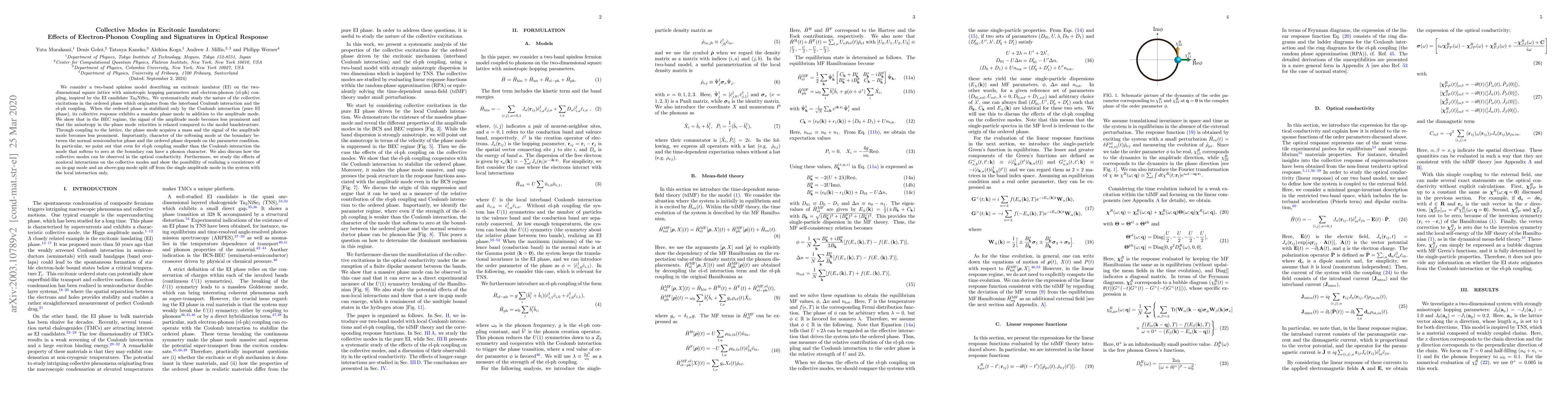 Researchers studied collective modes in excitonic insulators, finding that electron-phonon coupling can soften a mode to zero at the boundary between ordered and normal phases, potentially allowing for observation in optical conductivity.