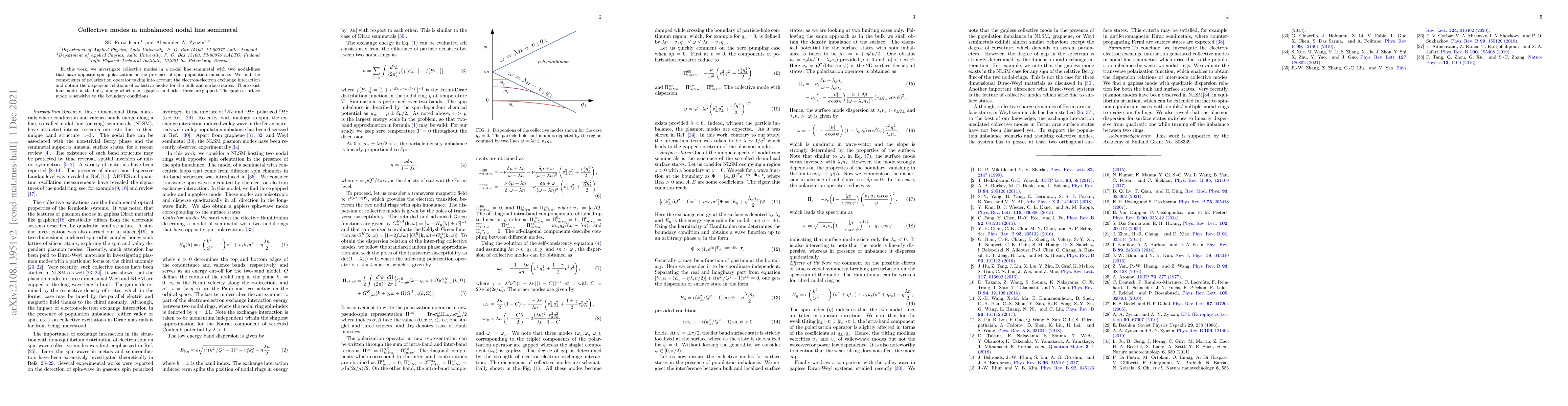 This study examines collective modes in an imbalanced nodal line semimetal featuring two oppositely spin-polarized nodal lines, revealing four bulk modes (one gapless and three gapped) and a boundary-sensitive gapless surface mode influenced by electron-electron interactions.