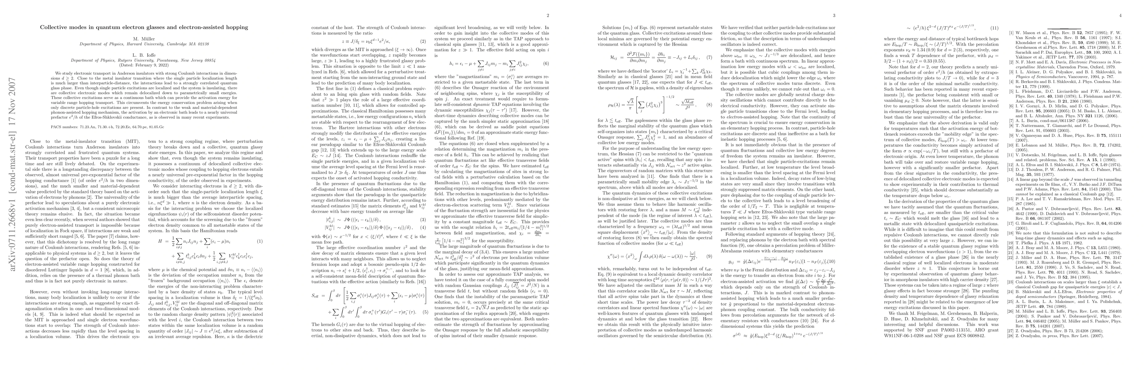The research explores electronic transport in strongly interacting Anderson insulators near the metal-insulator transition, identifying delocalized collective modes as a continuous energy source for variable range hopping. This mechanism, distinct from phonon-assisted hopping, explains the observed nearly universal e^2/h prefactor in Efros-Shklovskii conductance, providing insights into quantum electron glasses.