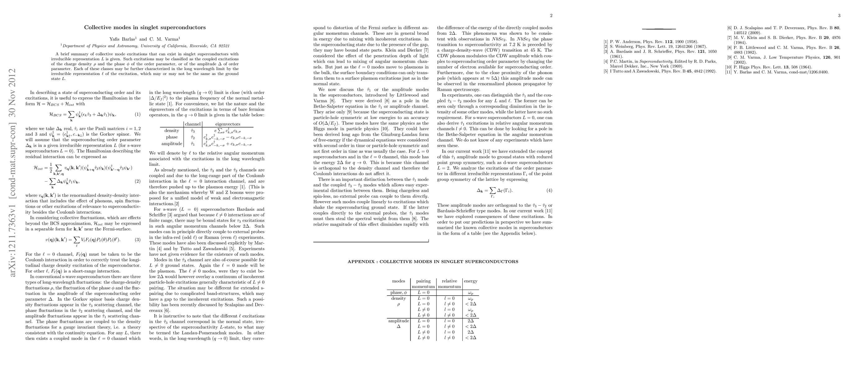 Research identifies collective mode excitations in singlet superconductors, characterized by coupled charge density and phase changes, or amplitude of the order parameter.