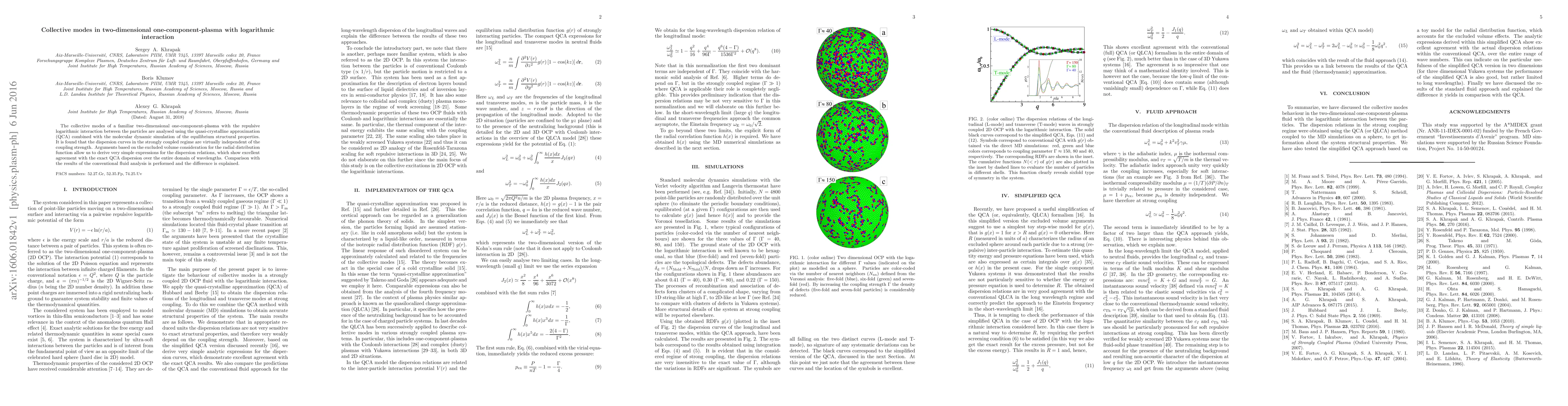 The research analyzes collective modes in a two-dimensional one-component plasma with logarithmic interaction using quasi-crystalline approximation and molecular dynamics. It finds that dispersion curves are largely independent of coupling strength, with derived expressions agreeing well with exact calculations. Differences from conventional fluid analysis are explained.