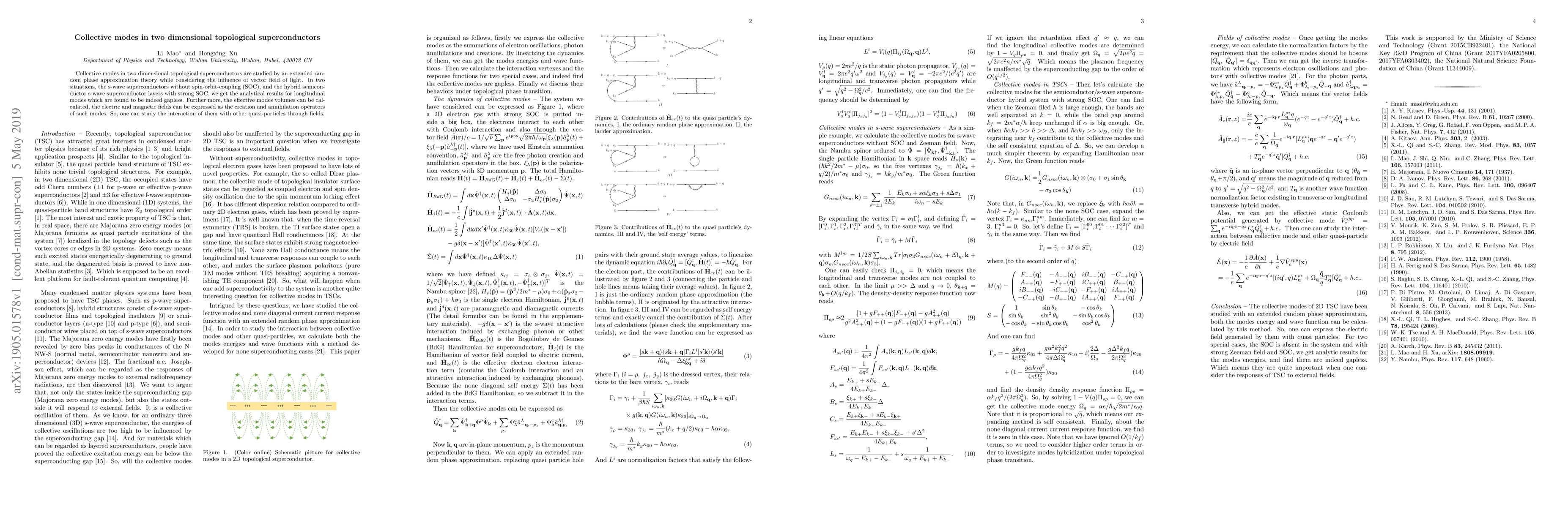 Collective modes in two dimensional topological superconductors are studied by an extended random phase approximation theory while considering the influence of vector field of light. In two situations, the s-wave superconductors without spin-orbit-coupling (SOC), and the hybrid semiconductor and s-wave superconductor layers with strong SOC, we get the analytical results for longitudinal modes which are found to be indeed gapless. Further more, the effective modes volumes can be calculated, the electric and magnetic fields can be expressed as the creation and annihilation operators of such modes. So, one can study the interaction of them with other quasi-particles through fields.